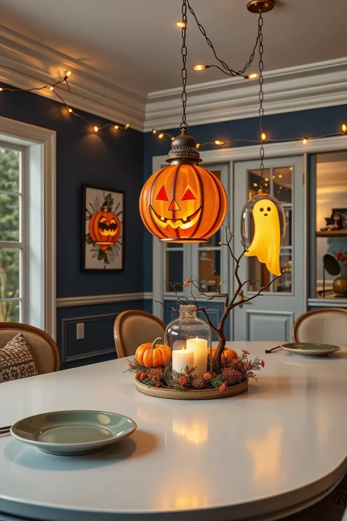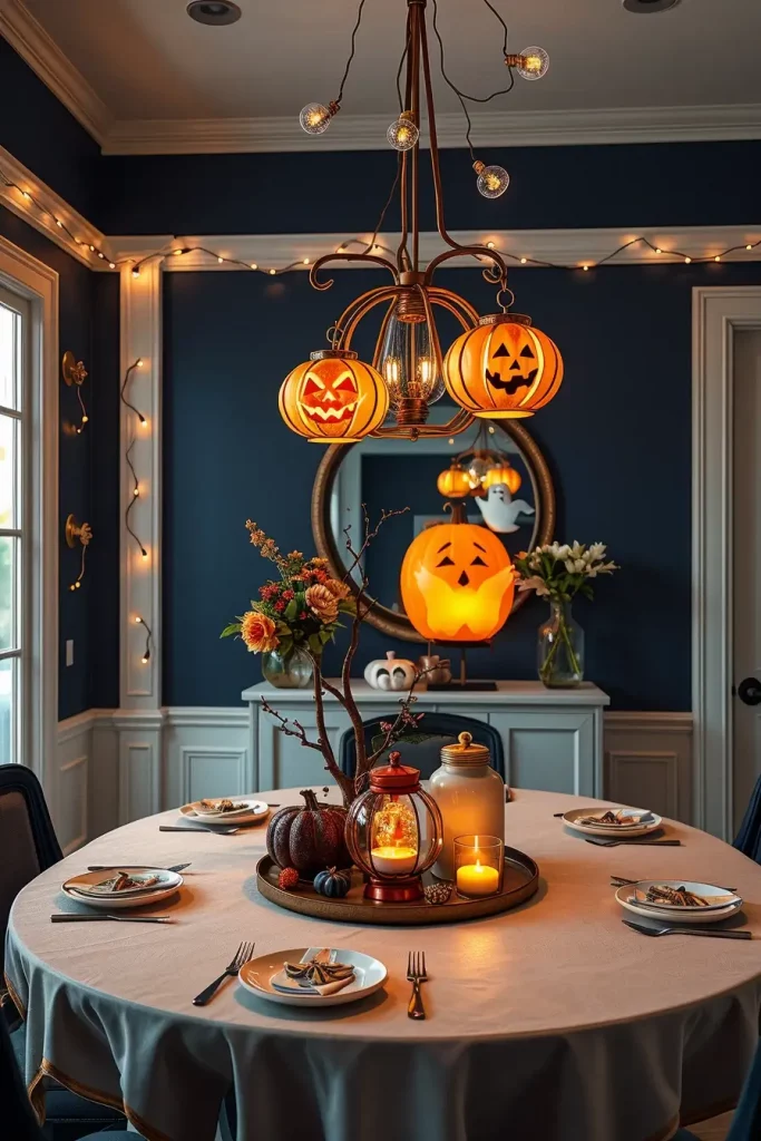 Lighting is an essential part of Halloween atmosphere, and I think that lanterns and LED lights as the central decoration is one of the most multifunctional methods to turn a dining room. The concept is perfect in both contemporary and classical interiors. I tend to suggest a deep neutral background, gray or navy walls with clean white trim and just a simple rectangular table with minimal clutter to allow the lights to shine.