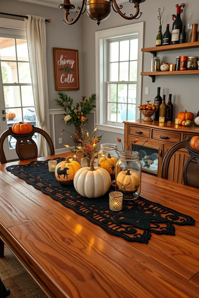 I would complement this appearance with glossy black place settings and orange linen napkins that will be tied with Halloween-themed rings, maybe in the form of bats or pumpkins. To complete the look, I would hang a black wreath or garland somewhere in the room to connect the theme across the room.