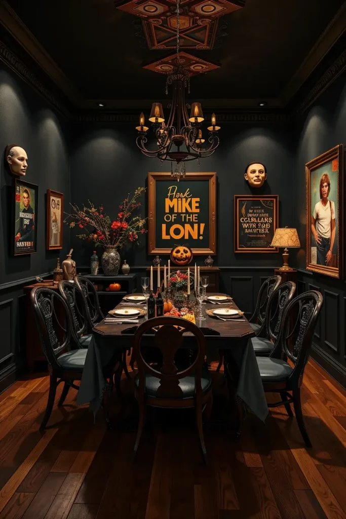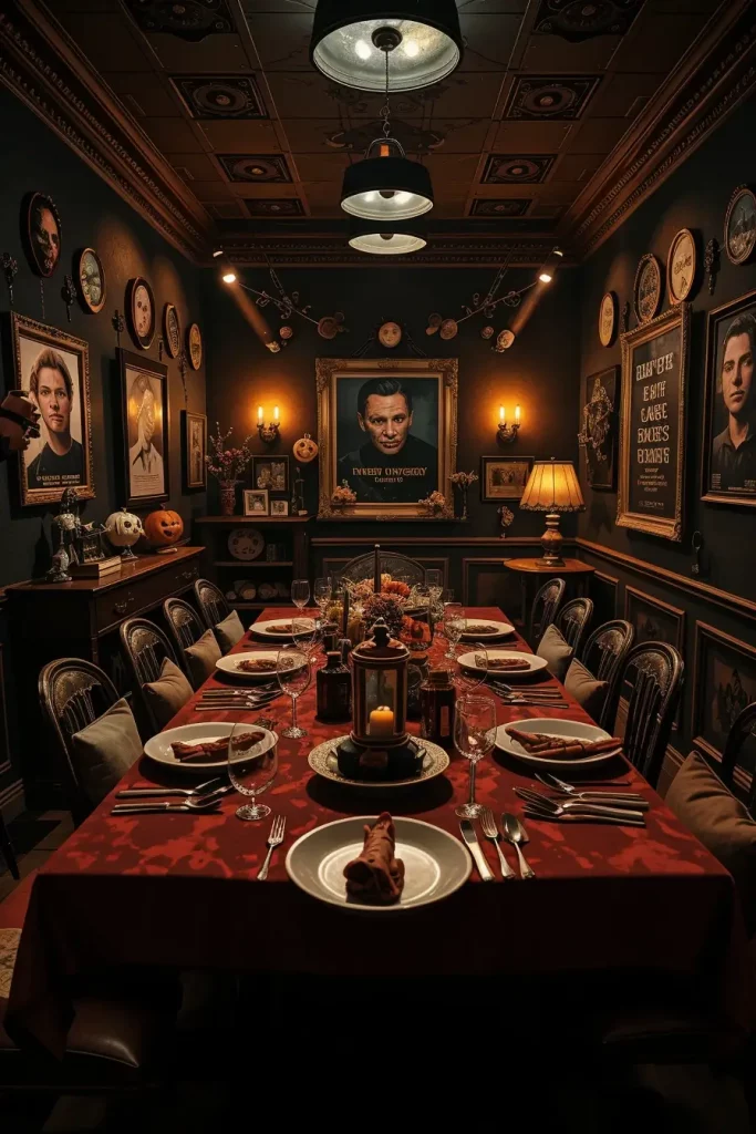 Movie-goers who enjoy horror films will appreciate a Halloween decoration that is a reference to the silver screen. I approach this theme by first selecting a specific movie or genre (e.g., slasher, gothic, supernatural), then designing a room that reflects its tone. The dark dining room with blackout curtains, faux-brick wallpaper, or dramatic murals is the perfect setting.