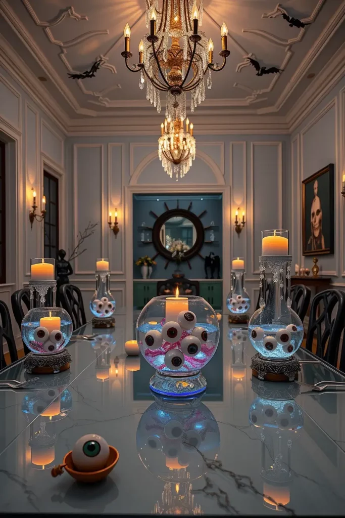 Floating centerpieces are an impressive option when it comes to Halloween 2025, and it is a good option when it comes to a more ethereal, surreal atmosphere. I usually apply this concept to modern rooms that are glossy or polished in finish- glass tables, lacquered surfaces, and white or black clean walls add to the effect perfectly.