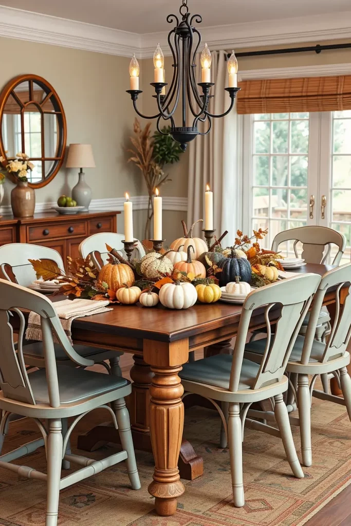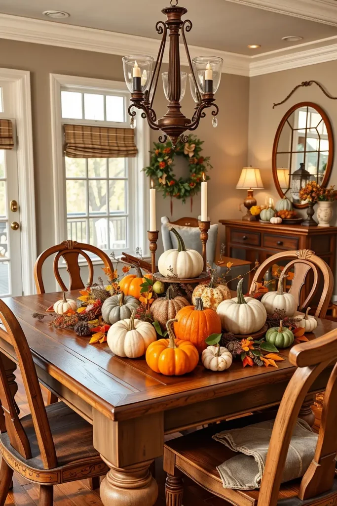As the centerpiece, take a variety of real or faux pumpkins of different sizes and colors, orange, white, green. Place them in the middle, alternated with candles, cinnamon sticks and small gourds. Pumpkins carved out can be used as vases to hold autumn flowers or as candy bowls. Combine this with linen napkins and antique style dinner ware.