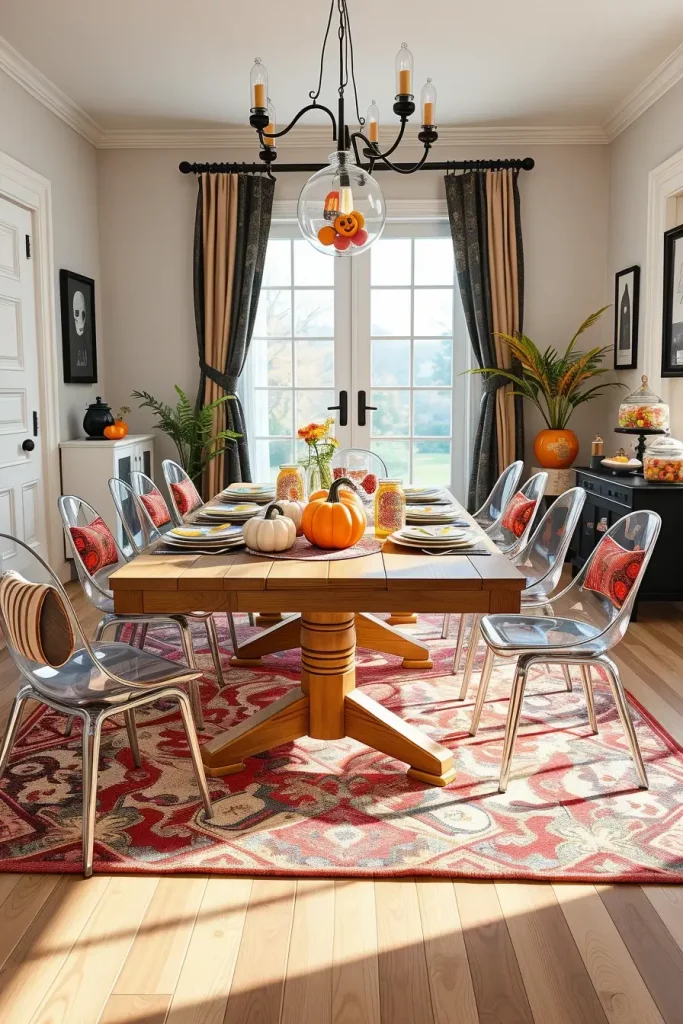 Not all people want their Halloween decorations to be spooky and gloomy- colorful Halloween centerpieces are becoming more popular in 2025, particularly in houses with children or active party themes. In contemporary eclectic rooms, where the walls are white or light neutral colors, neon orange, lime green, purple and pink are used as energy in the room. Picture: brightly colored carpets, light wood tables, and acrylic chairs.
