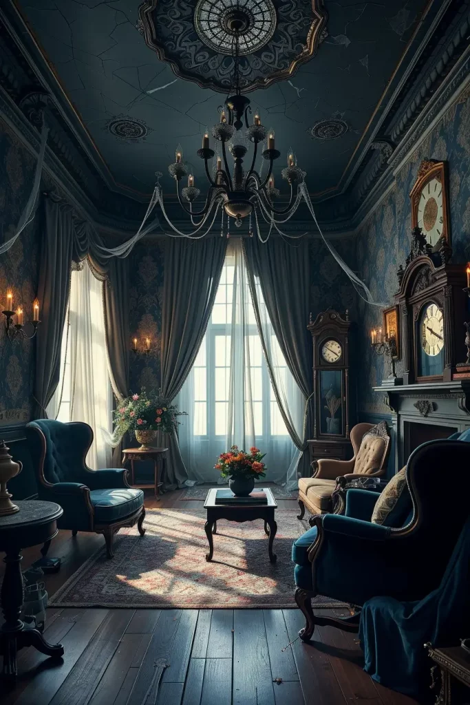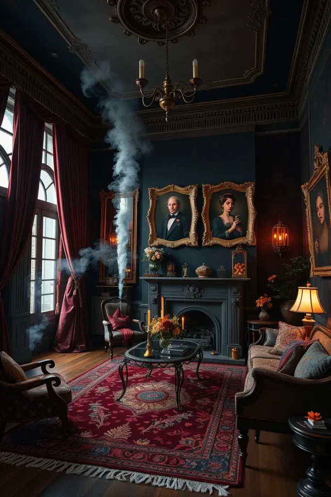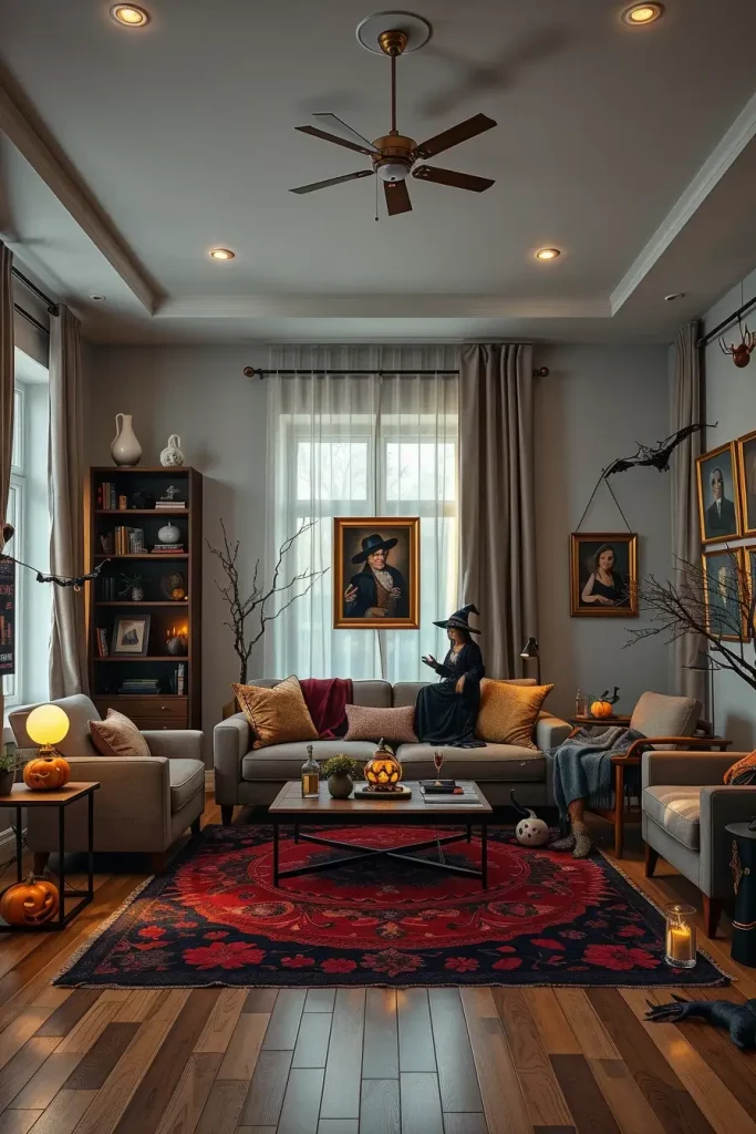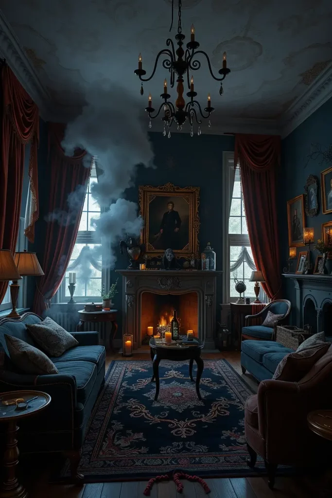 Creating a haunted house theme in your living room does not mean adding props, but creating an immersive environment. I use dim lights, dark colors like navy and oxblood to seal the open spaces and heavy velvet curtains. In one corner, put a fog machine to create a creepy mist. The room is grounded by a huge area rug with Gothic prints, and old frames of spooky portraits or lenticular art on the walls.