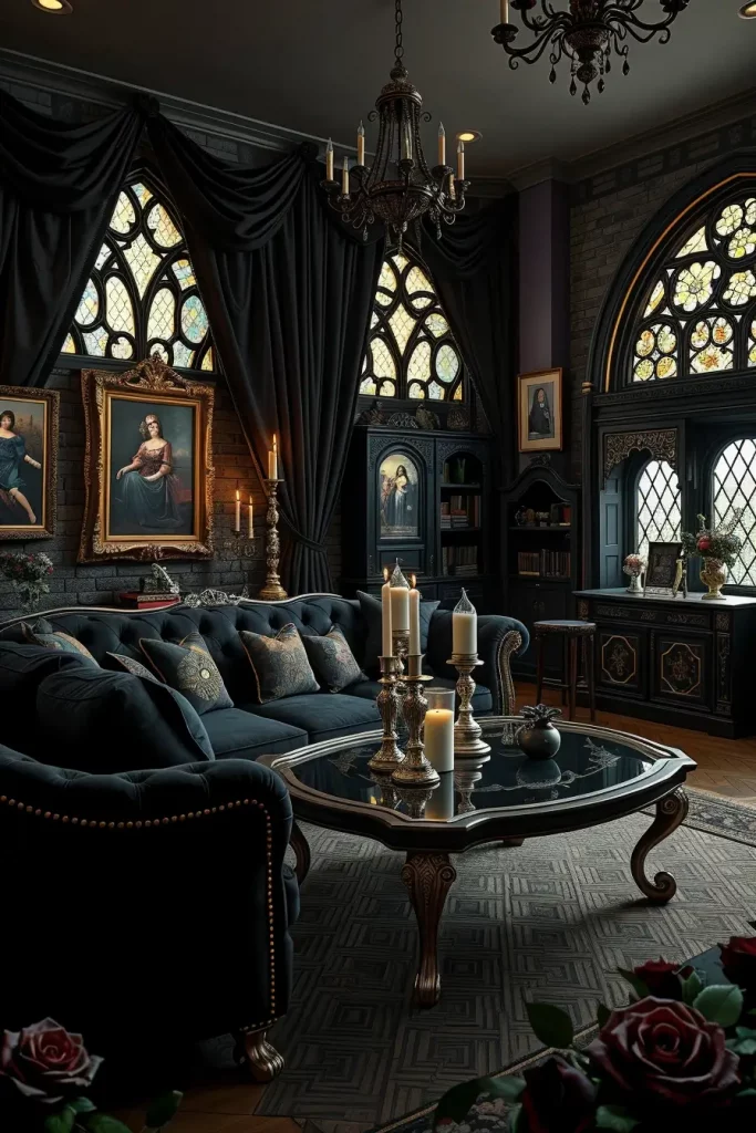 I am inspired by the medieval cathedrals and the interiors of castles. According to Architectural Digest, the Gothic appearance is all about drama and symbolism. I used to stick stained glass peel-and-stick films on my windows and it looked amazing with warm lighting. Dark flowers especially black roses or burgundy peonies make great accents.