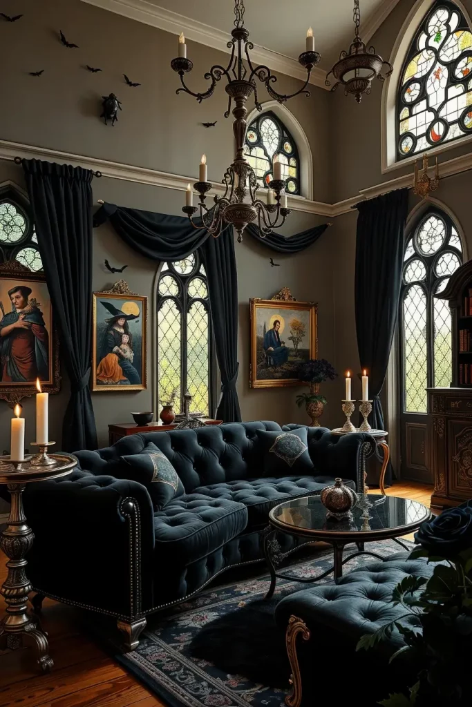 Halloween decor can be theatrical in a Gothic way. I prefer to hang long black or deep purple curtains over walls–even temporarily. The Gothic elegance is immediately associated with velvet and brocade materials. A room can be turned into a gloomy den with a black tufted sofa, silver-bordered mirrors, and candle-lit sconces. The atmosphere is enhanced by paintings of religious or mythological nature.