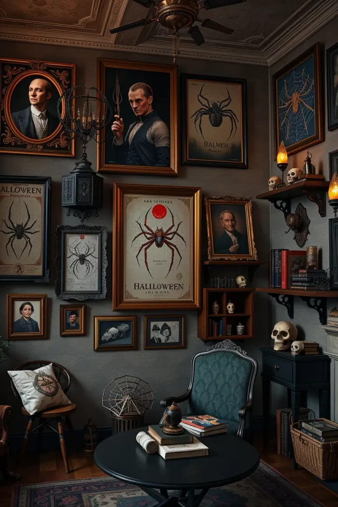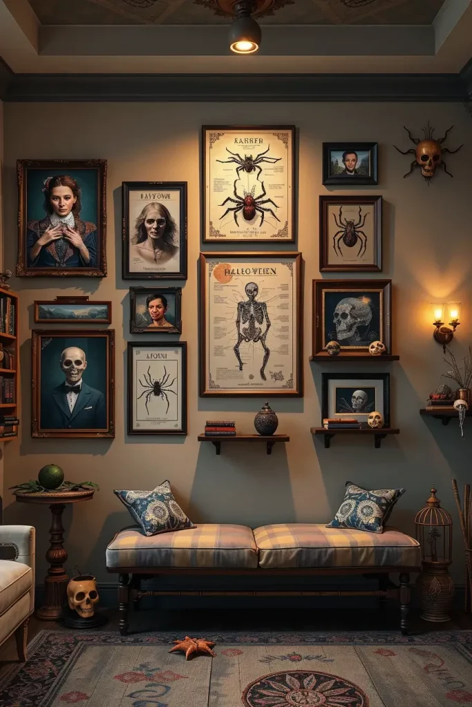 One of the cheapest and best methods to make a creepy Halloween atmosphere inside is wall decor. I never begin without substituting the available artworks with haunted portraits, old horror posters, or optical illusion prints. I also make gallery walls with mismatched frames, and then I put lenticular images on them so that they change as you walk by.