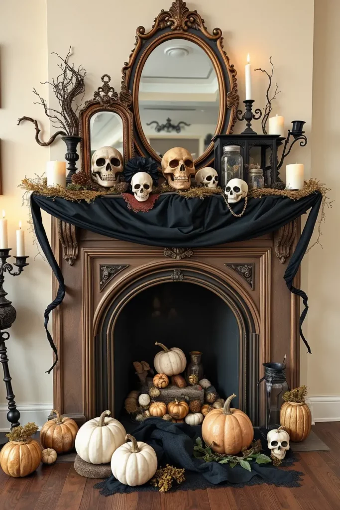 A fireplace mantel is one of the most prominent places in a room, which is why it is an ideal place to decorate it with Halloween items. My first step is always to add texture and height to make the composition interesting to look at. In 2025, Halloween is all about combining natural materials such as dried branches and moss with Halloween traditional symbols such as skulls and pumpkins. I use a dark fabric runner as a foundation and then I add height with objects that introduce color and form.