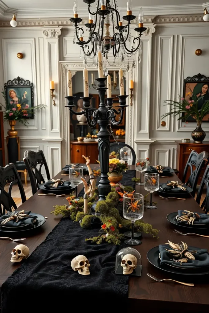My personal favorite is a metal candelabra with dripping black candles, with moss, small gourds, and miniature skeleton hands around. I also use glass cloches with faux insects or bone fragments or single dark roses. Black charger plates, gold cutlery, and cloth napkins with small skull charms can be used as place settings. It’s a mix of refined and creepy.