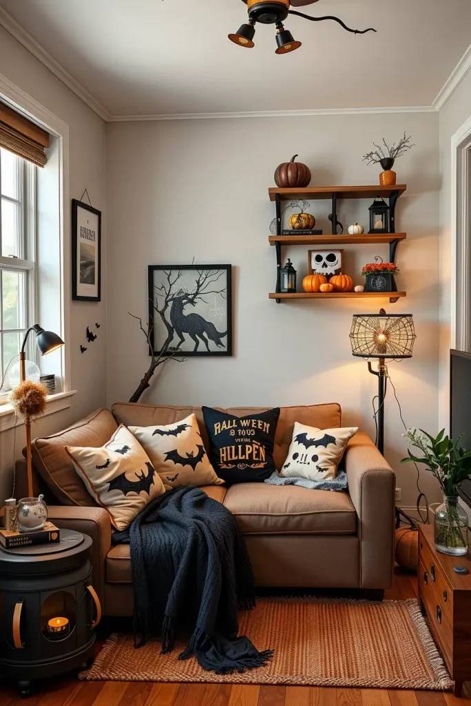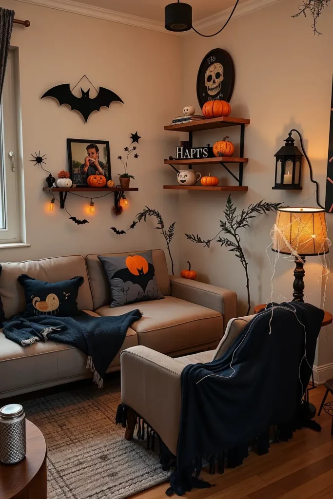 When it comes to decorating a smaller room, such as a studio or one-bedroom apartment, the trick is to make it warm yet celebratory. I never think of how to maximize the impact without overcrowding the space. Dark Halloween accents even stand out more on neutral backgrounds such as white walls or wood floors. I incorporate multipurpose decor- pillows with bats, throws in deep autumn hues and decals on the wall that do not harm the paint.