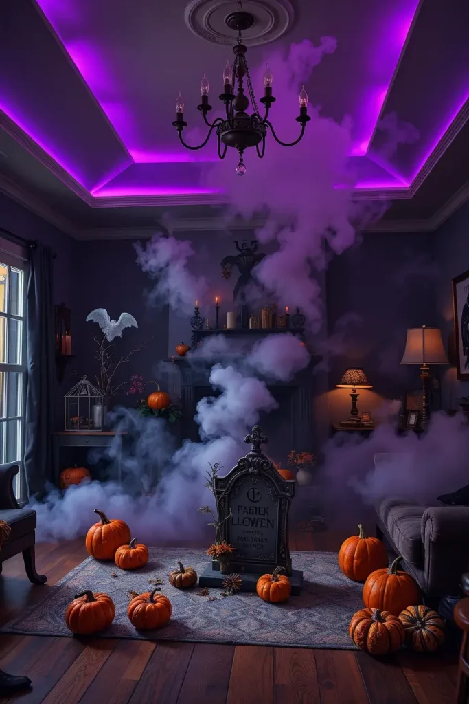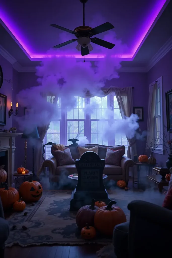 It is all about placement. I tend to place my fog machine by the doors or under the furniture to have the mist creep out gradually. In order to sustain the illusion, you may hide the machine behind pumpkins or a plastic tombstone. Combine it with purple or green uplighting to make the fog have an unearthly glow. It is always advisable to air the place after to avoid smoke.
