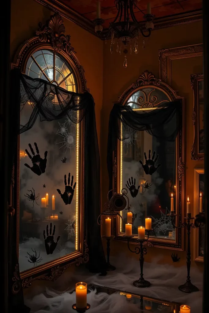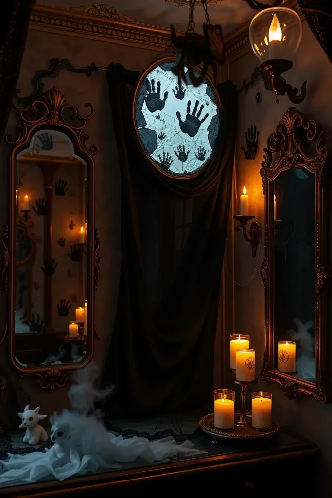 I like to use antique frames with broken glass or foggy finishes decoratively. Transparent decals or faux handprints can be used as well to create an impression of something supernatural. I also have backlit mirrors with LED strips to give a glowing edge, making it more mysterious. The creepy atmosphere is enhanced by hanging mirrors in front of candles or other flickering lights.