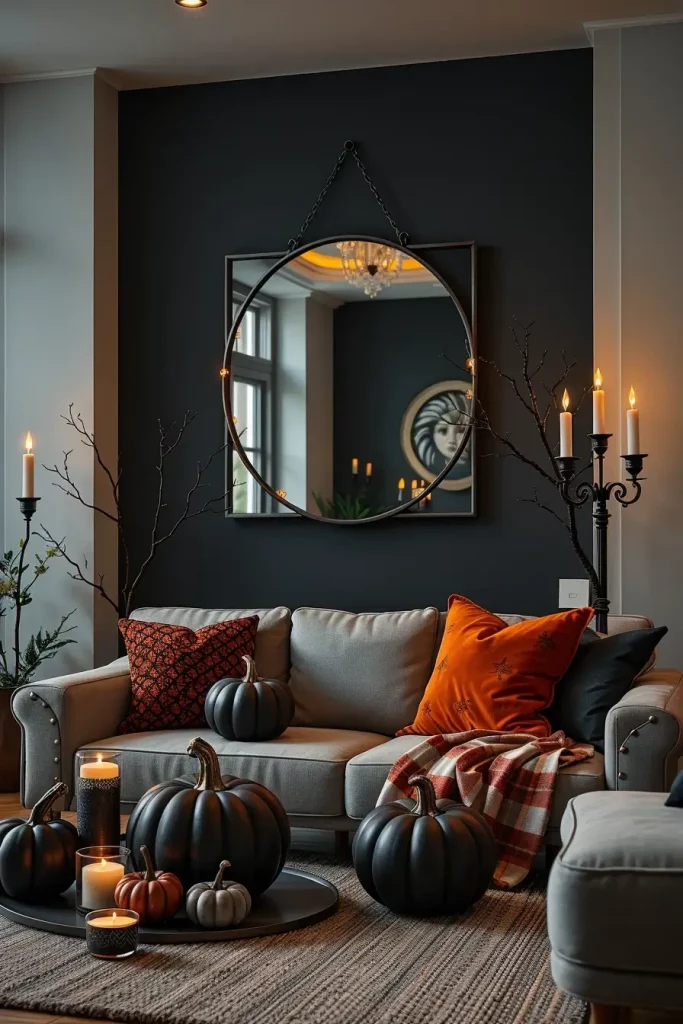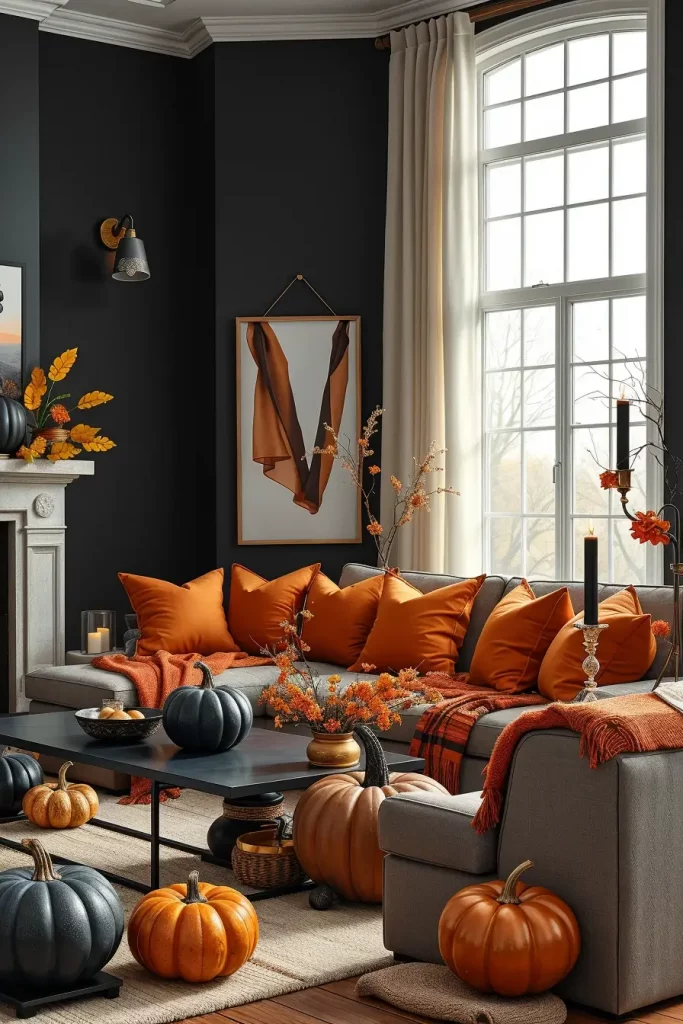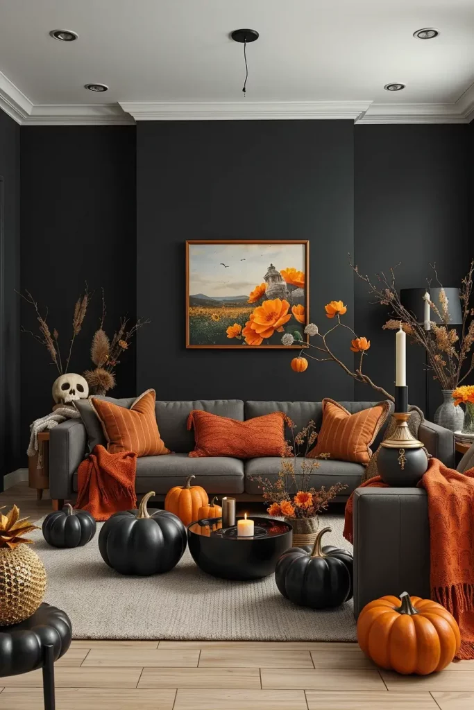It does not imply that your space must be kitschy when using the traditional Halloween color scheme of black and orange. I prefer a balanced appearance, i.e. matte finishes, soft materials, and modern silhouettes. The burnt orange pillows, vases, or table runners will look beautiful with black accent walls or wallpaper with some subtle patterns.