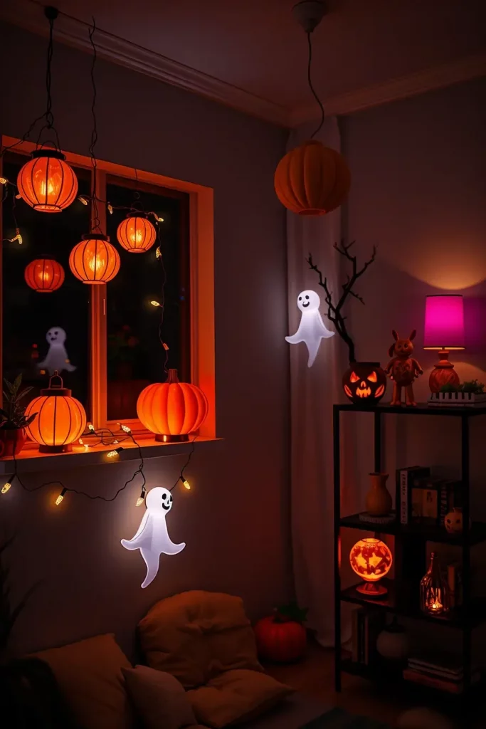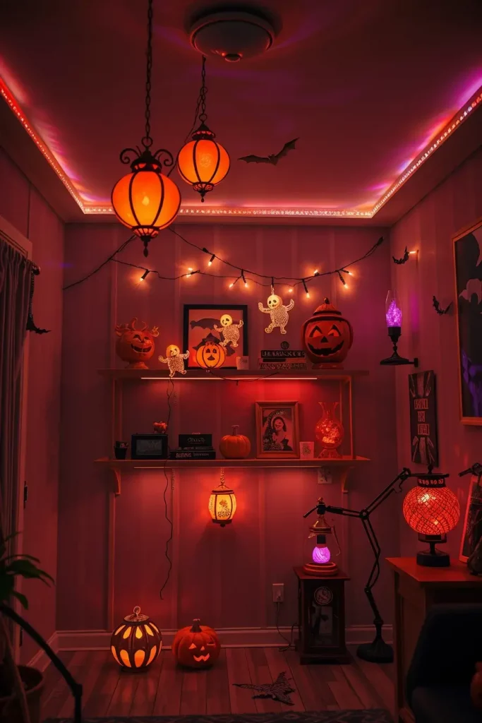 I also put black metal lanterns in the room with no flame candles. I place string lights in the form of bats or ghosts in corners. They may be hung on curtain rods or open shelves to produce ambient shadows. The entire atmosphere of the room is changed in a second by table lamps with red or purple light bulbs.