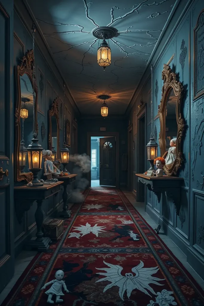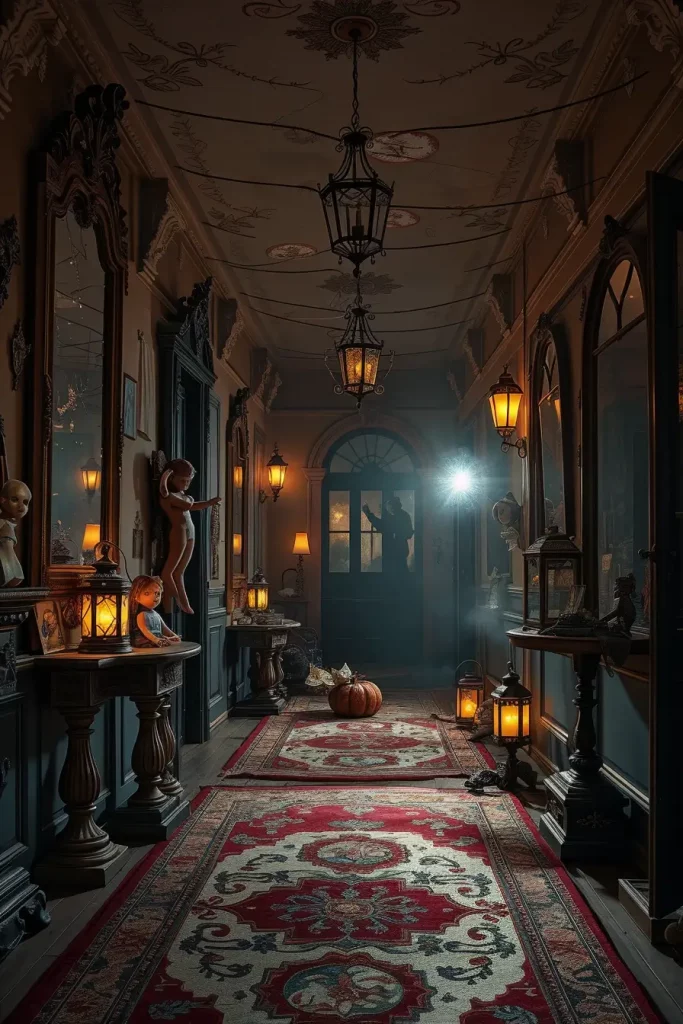 I would recommend long and distressed runners with washed out gothic designs. On tile or wood floors, use them in opposite. To decorate the path, place props of tombstones, creepy dolls, and LED lanterns. I usually add cracked mirror panels that are leaning against walls to make it look creepy and deserted. All these factors go hand in hand to ensure that the hallway is functional yet immersive aesthetically.