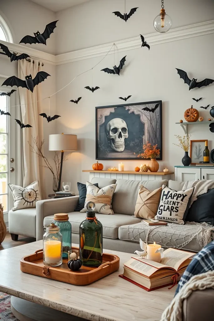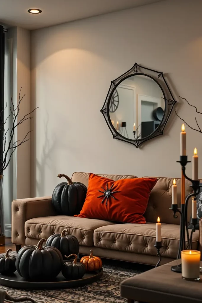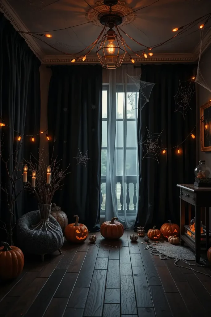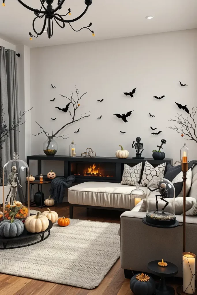 I tend to begin with black and white accents: black candlesticks, matte pumpkins, and classy wall decals. Make use of mood lighting, i.e., amber LED strips under furniture or behind curtains to cast soft lights. There is also a sophisticated touch with glass cloches containing mini skeletons or spiders.