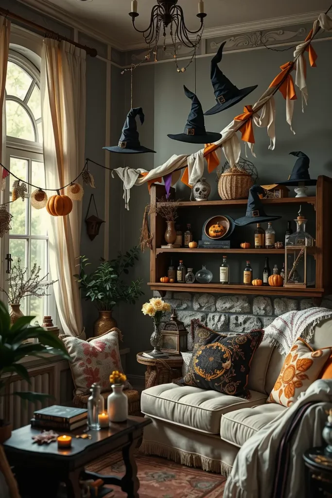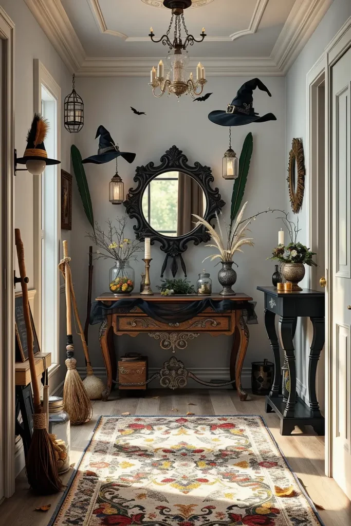 One of the most flexible indoor Halloween decoration ideas is the witchcraft-themed setups. Personally, I enjoy a little magic in between rooms, such as a hallway or mudroom. These are the areas that are overlooked most of the time, yet a little bit of dark magic can make a world of difference.