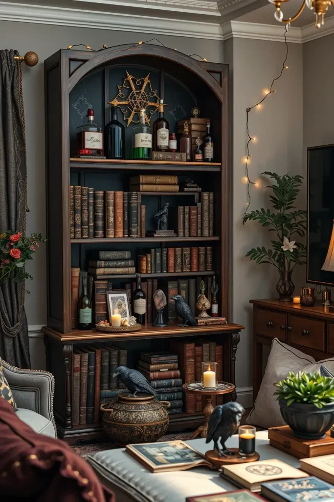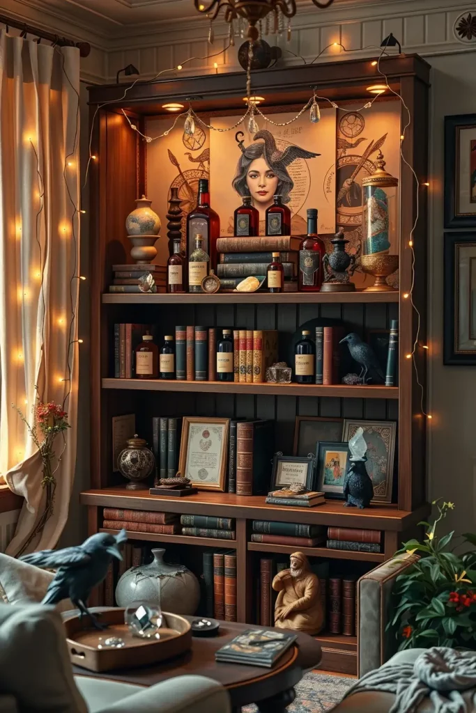 I begin by cleaning at least one or two shelves and putting dark material or black paper as a background. Then I place bottles of potions, old-fashioned-looking books, tarot cards, and perhaps a fake raven or two. The mystical glow can be achieved with twinkle lights or flameless candles. Vintage mirrors and crystal balls are also an ideal addition.
