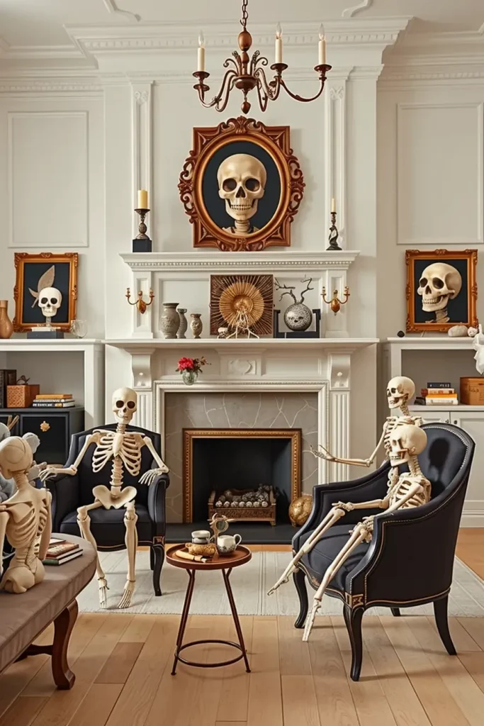 The one I like best is to put a poseable skeleton on a reading chair with a newspaper and glasses–something funny but not vulgar. Mantels and shelves look beautiful with skull sculptures in matte black or stone finishes. I have also used skeletal hand trays with candy or small candles on side tables.
