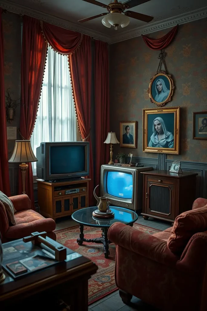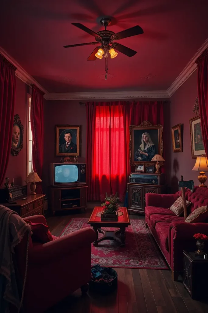 My typical beginning is the central location: a living room where the decor is meant to resemble a haunted hotel lounge or a suburban living room with blood-red drapes, retro-furniture, and old radios. Add some props like fake axes, non-working TVs, haunted photographs, or Ouija boards to make it look creepily real. Broken windows or creepy shadows stickers can create that movie magic without causing any damage to walls.