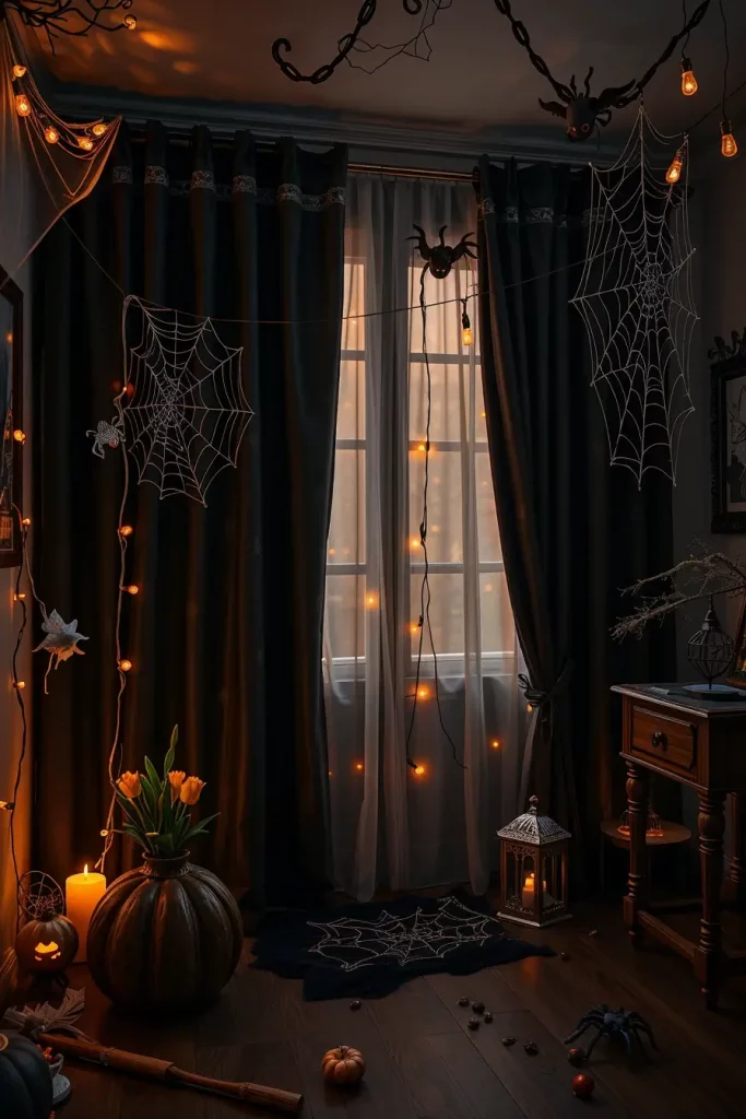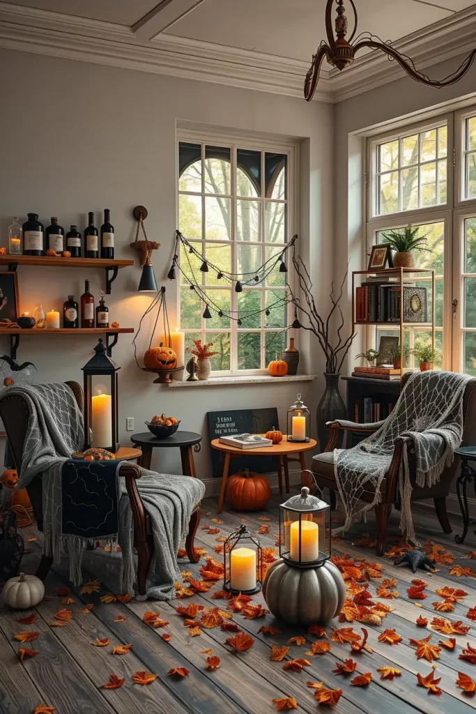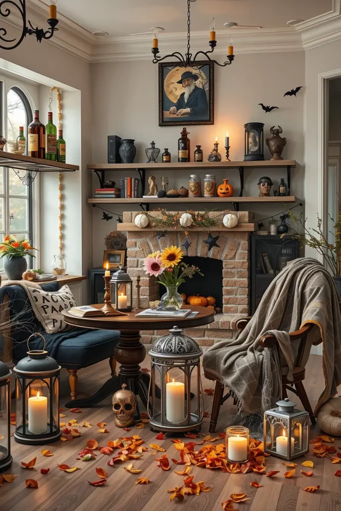 In smaller spaces, I would suggest that one work vertically. Floating shelves are turned into mini altars of spookiness with candles, small pumpkins, and hanging mini lanterns. I would also recommend sneaking in themed things on window ledges, coffee tables, and kitchen counters. Faux cobwebs over bookshelves or lamp shades have an immediate Halloween flair but do not require any additional space.
