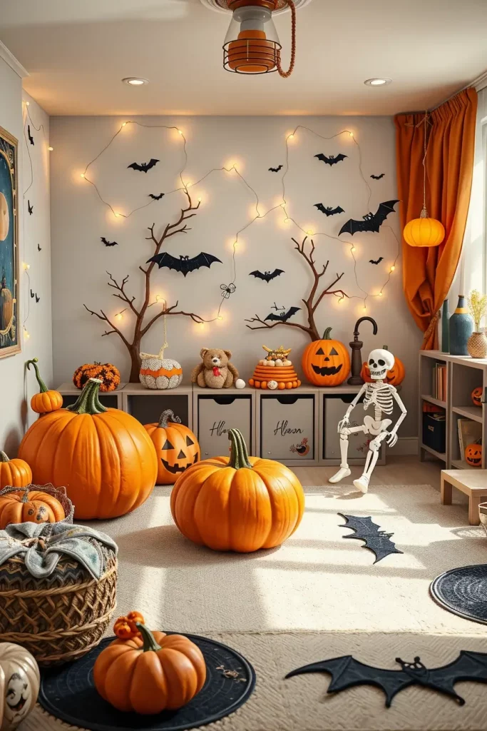 I tend to put plush Halloween toys on shelves, non-glass lanterns, and light-up books. Stick up friendly skeleton or pumpkin character wall stickers that are removable. Seasonal foam play mats such as bats or stars are fun and safe. Hang fairy lights and garlands to make corners brighter and themed storage bins to store costumes and candy buckets.