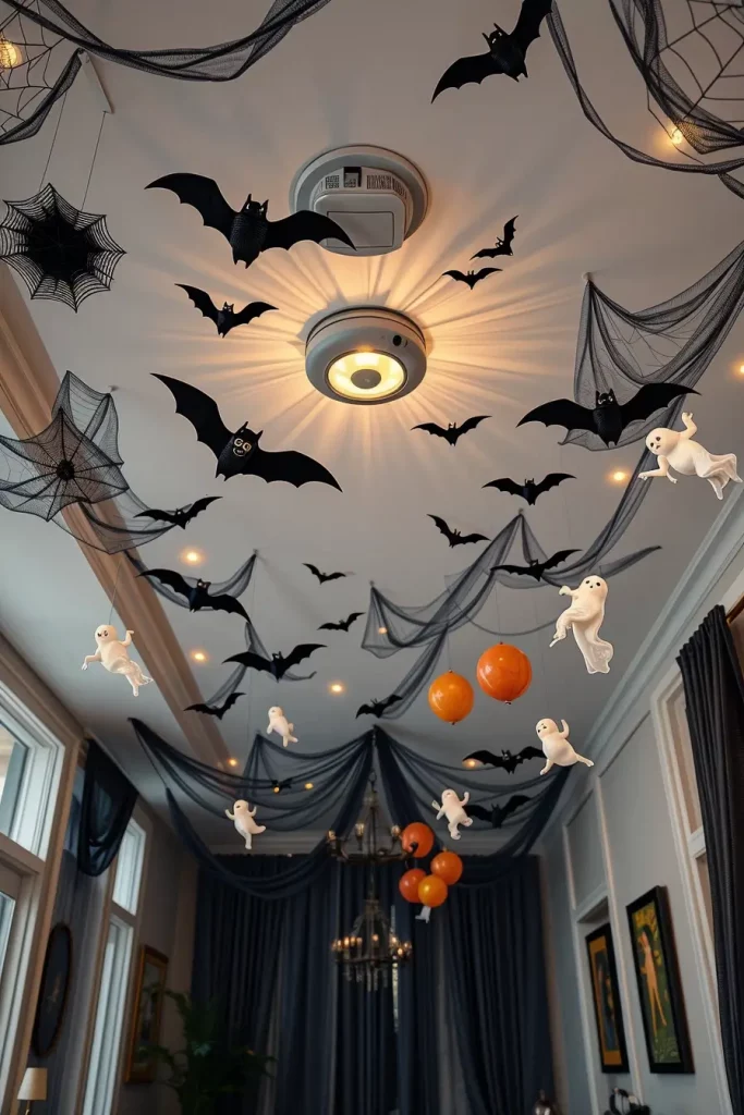 Another area that is usually ignored in indoor Halloween design is the ceiling decor, which is a genius idea to complete the immersion of your guests in the haunted setting. In 2025, I have begun to pay more attention to the overhead visuals, particularly in areas guests will spend time in. It can be cobweb-ridden chandeliers or floating ghosts, but the ceiling provides verticality that ties the whole room together.
