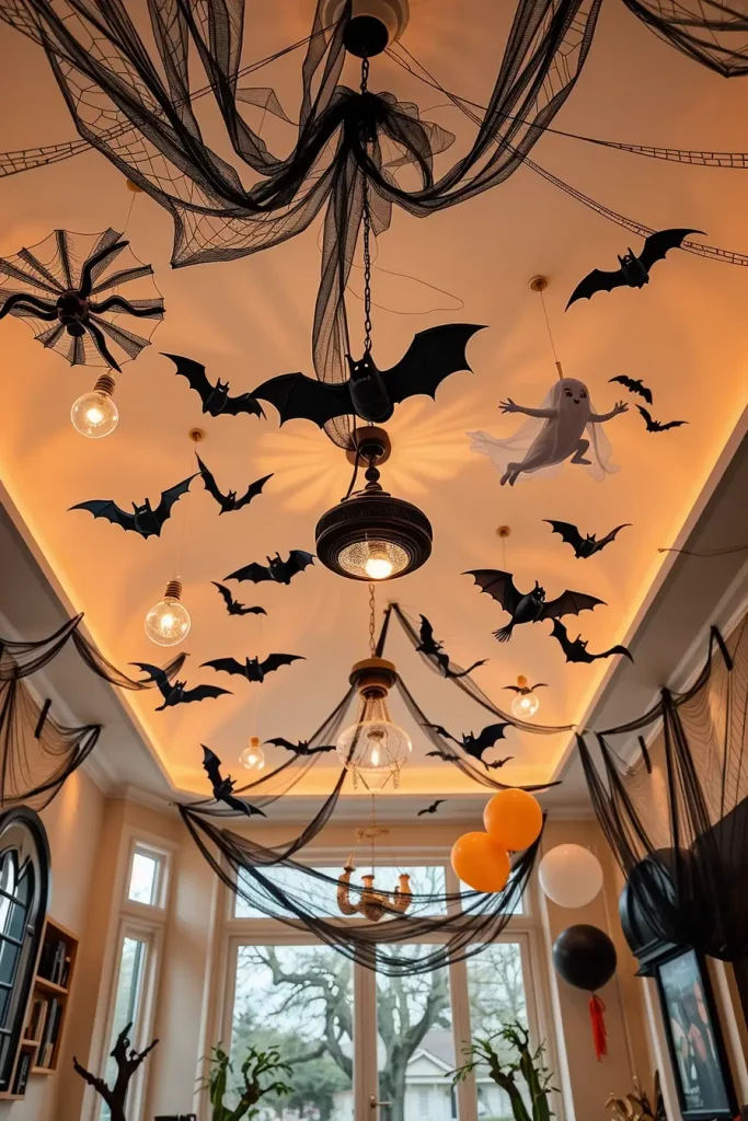 To create a dramatic effect, I employ gauzy black tulle that is stretched across the corners of the ceiling and is accompanied by the use of string lights to create the effect of spiderwebs. To get that floating in air effect, the hanging props, such as paper bats, skeletons, or ghost shapes are suspended using almost invisible thread. I cover the ceiling of dining rooms with black mesh netting and plastic rats sticking out. Spinning shadows of witches or swarming insects can be projected on the ceiling to create more tension.