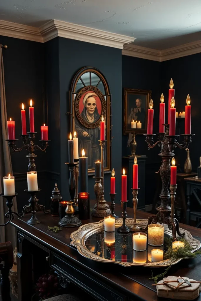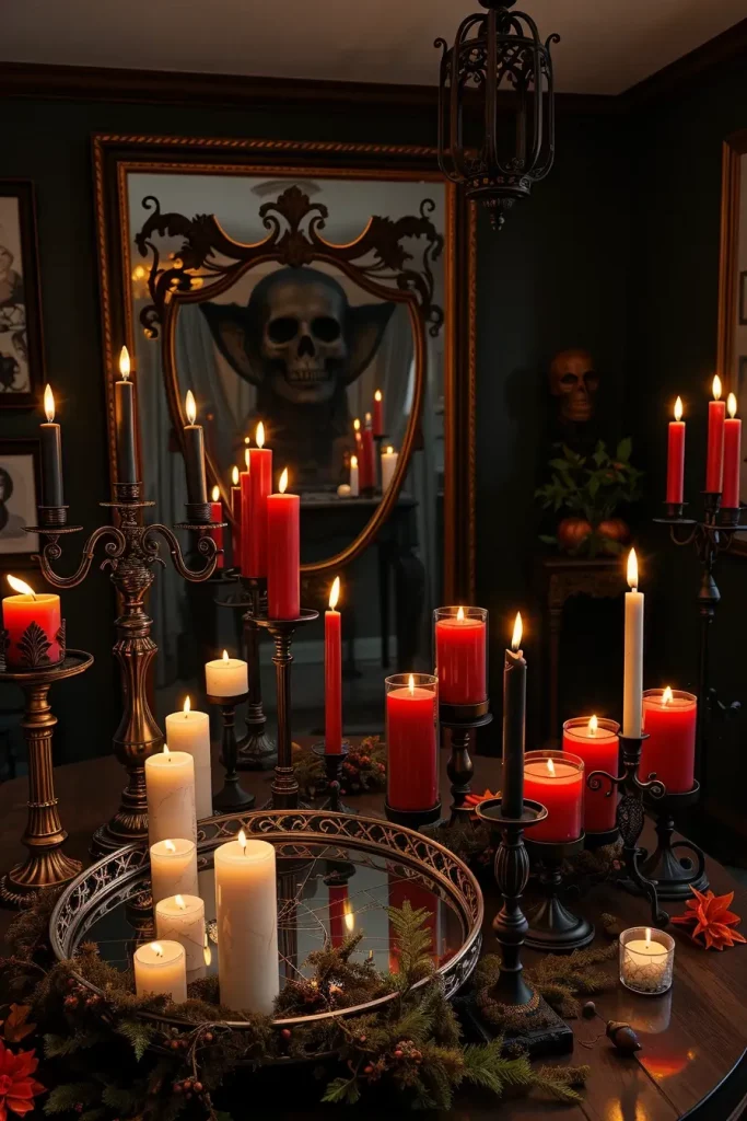 Another detail that you can incorporate here is reflective surfaces, so put some mirrors behind the candles to multiply the flicker and increase the creepiness. A side table or a credenza with a mirror can be very beautiful.
