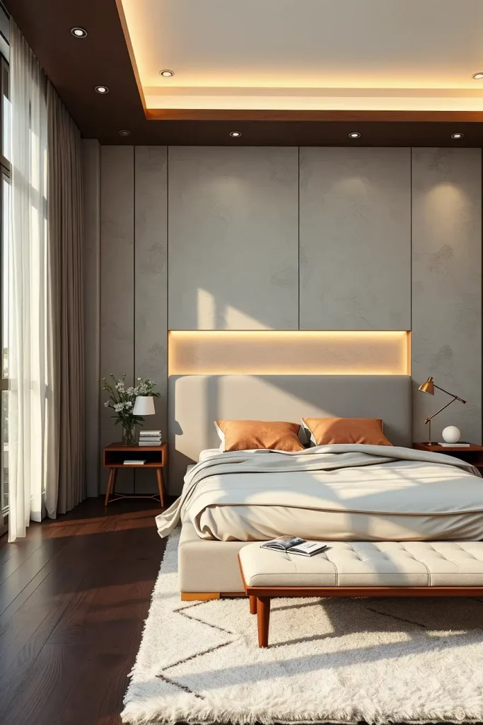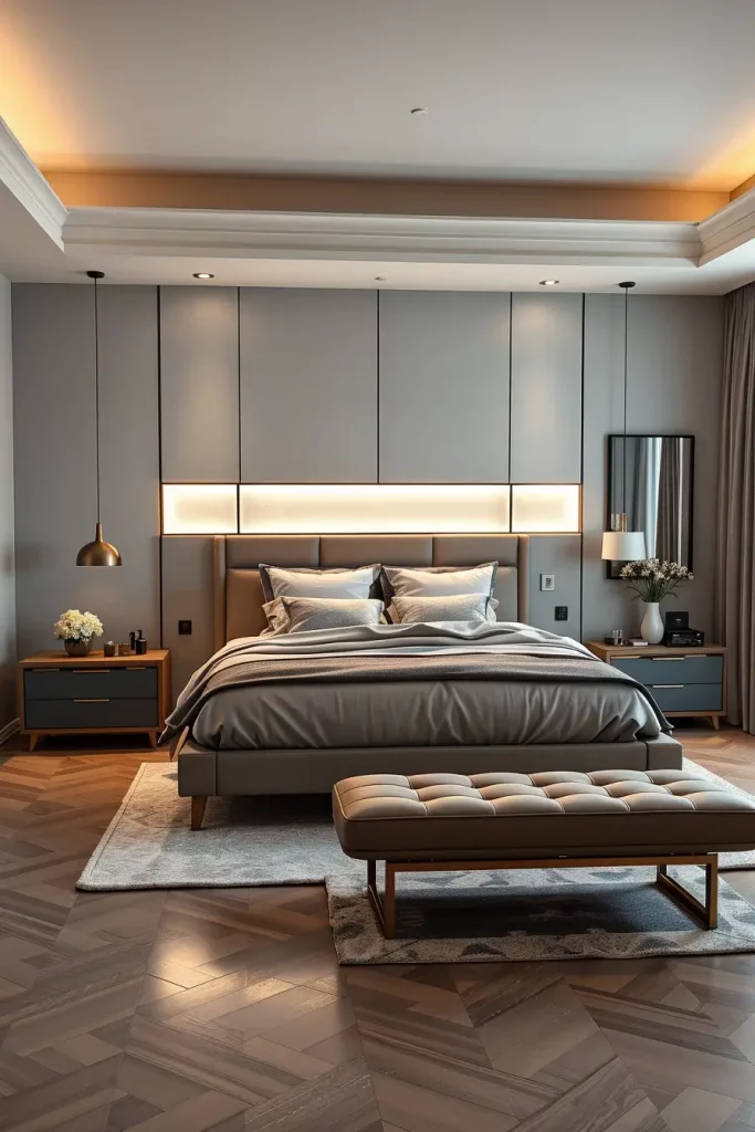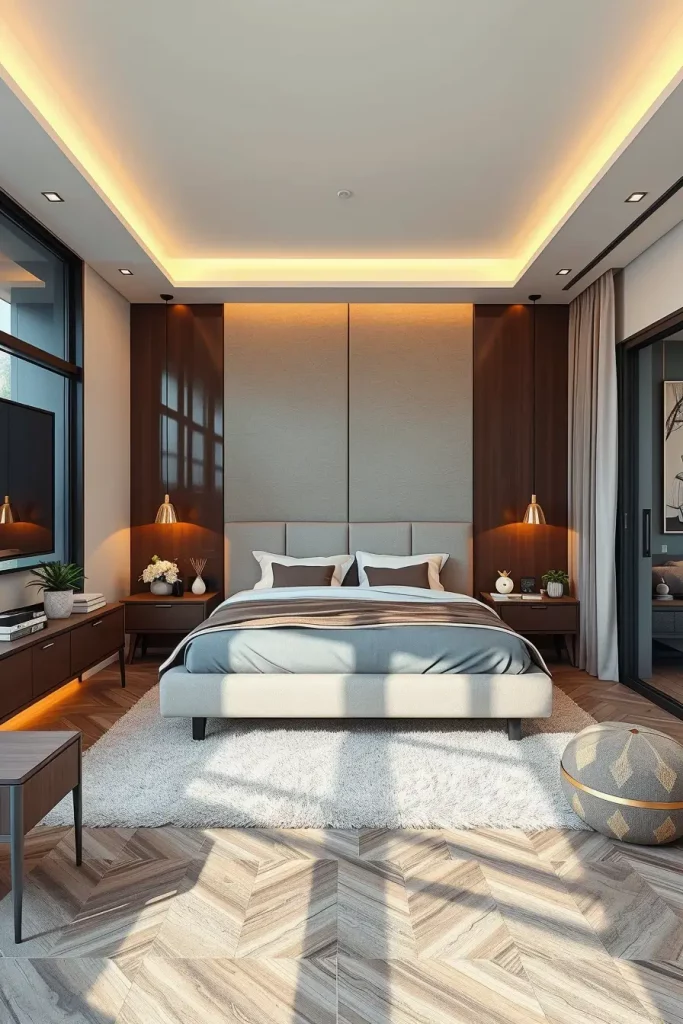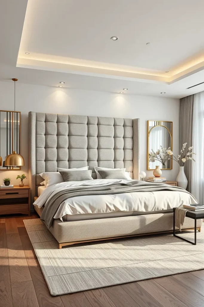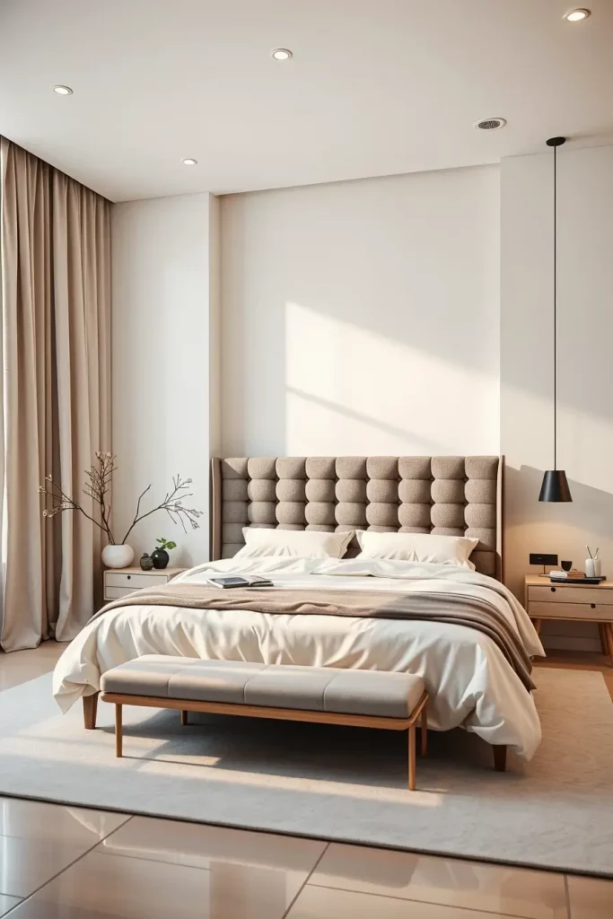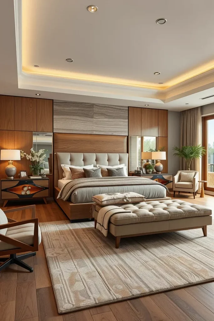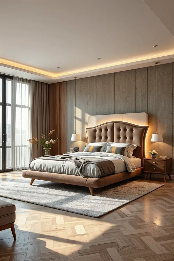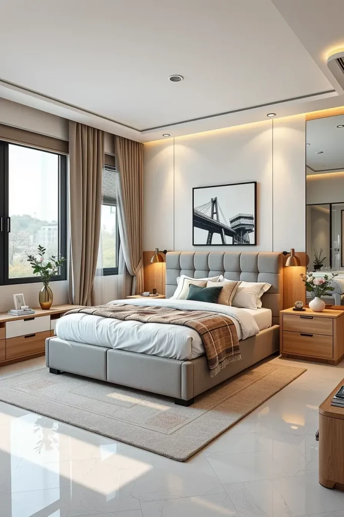 I will add smooth nightstands, built-in headboards with concealed light, and neutral fabrics like stylized linens or plush wool to this kind of interior. These are combined to maintain the general modern aesthetic, which is both comfortable and unified. I also enjoy the introduction of sculptural lamp or a plain bench at the bottom of the bed to finish the look without taking away the clean lines.