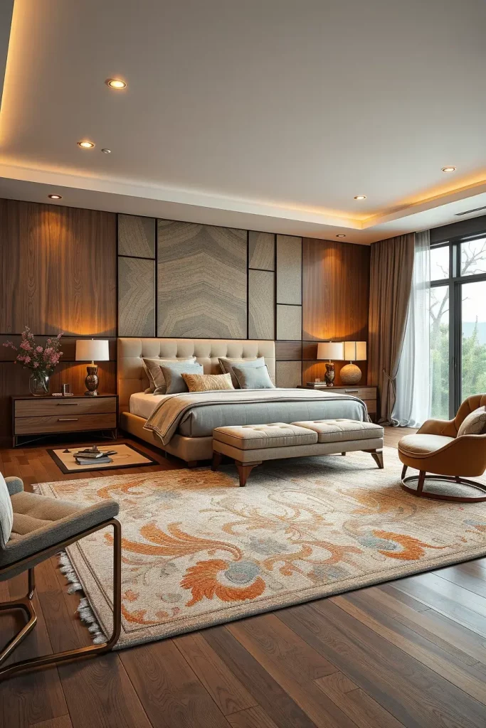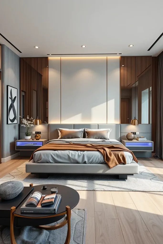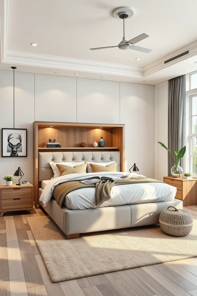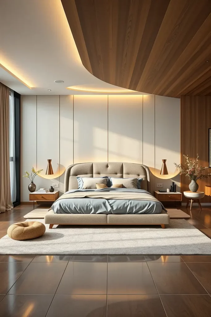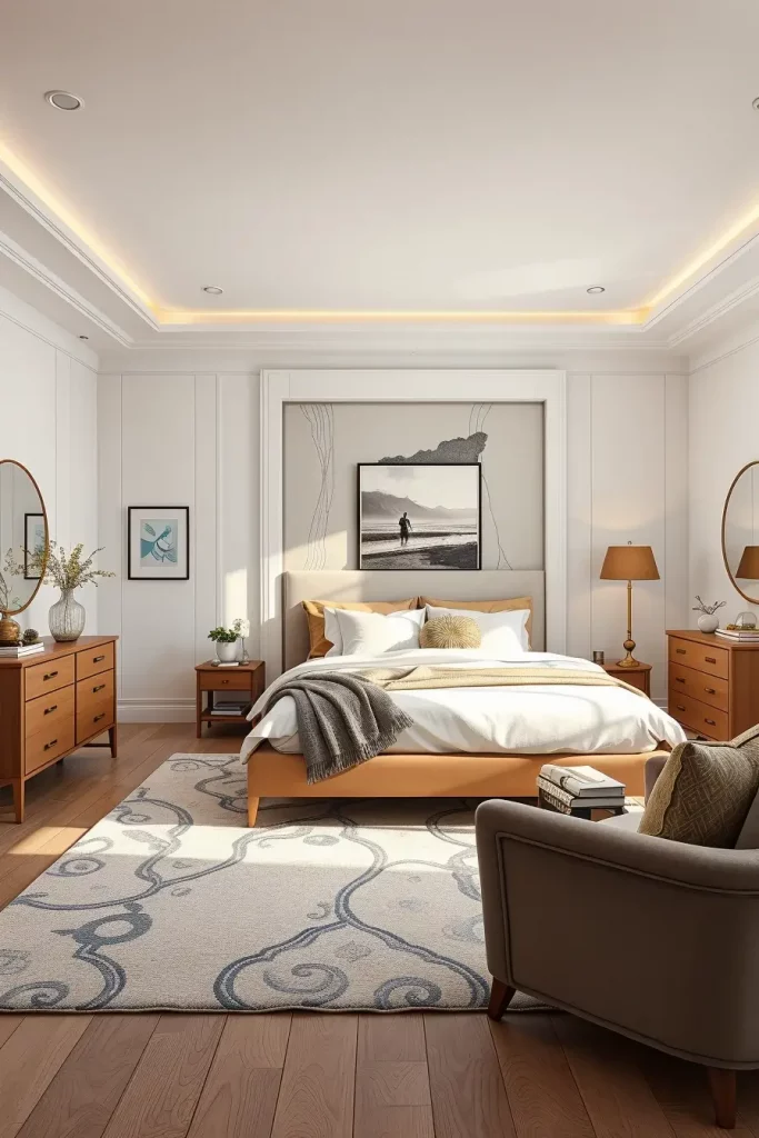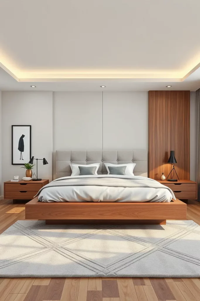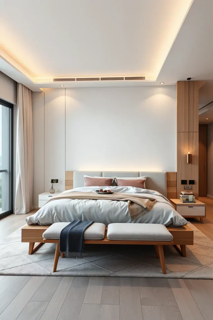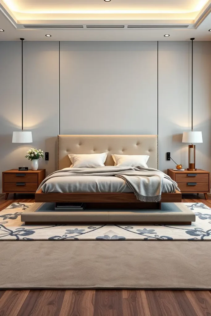 I will add smooth nightstands, built-in headboards with concealed light, and neutral fabrics like stylized linens or plush wool to this kind of interior. These are combined to maintain the general modern aesthetic, which is both comfortable and unified. I also enjoy the introduction of sculptural lamp or a plain bench at the bottom of the bed to finish the look without taking away the clean lines.