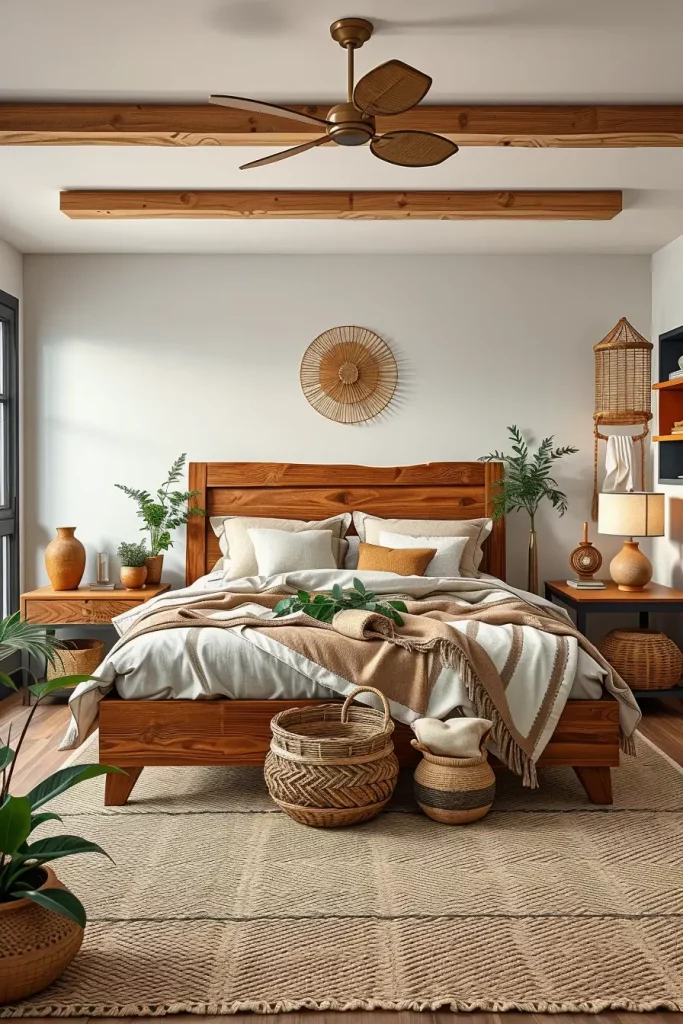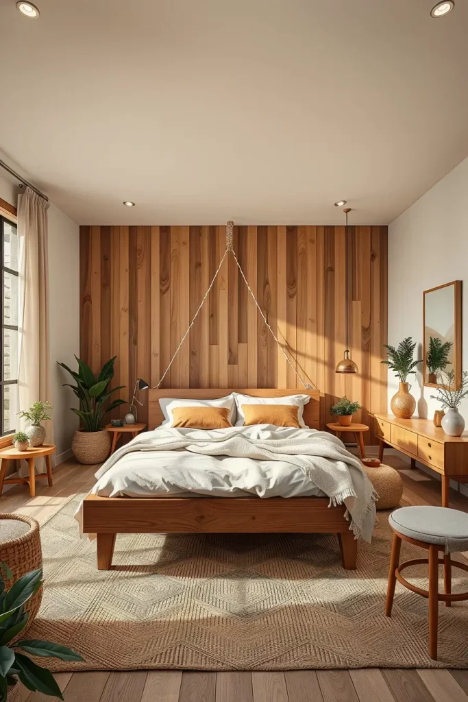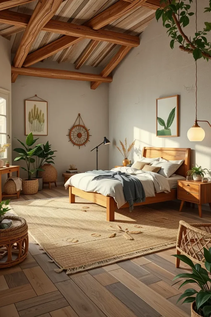 To create a complete environment, I will employ complementary pieces of furniture in these interiors, including wooden nightstands, woven baskets, neutral carpets, and earth-colored beddings. The natural theme is reinforced by details such as linens, which are soft-beige, table lamps of the ceramic type, and greenery. I like woods like walnut, oak and ash because they are rich and simple at the same time.
