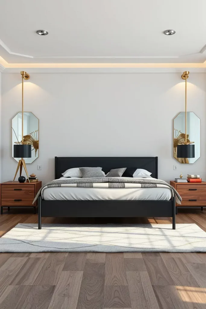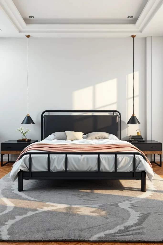 I usually add such items of furniture as metal-and-wood nightstands, geometric lamps, and crisp cotton bedding that adds the sleek line of the bed to the simplicity of the frame. A big rug will be used to cushion the appearance and wall art or sculptural decor can add subtle contrast. The mixture of metal and warm accents contributes to the absence of cold or excessively linear look.