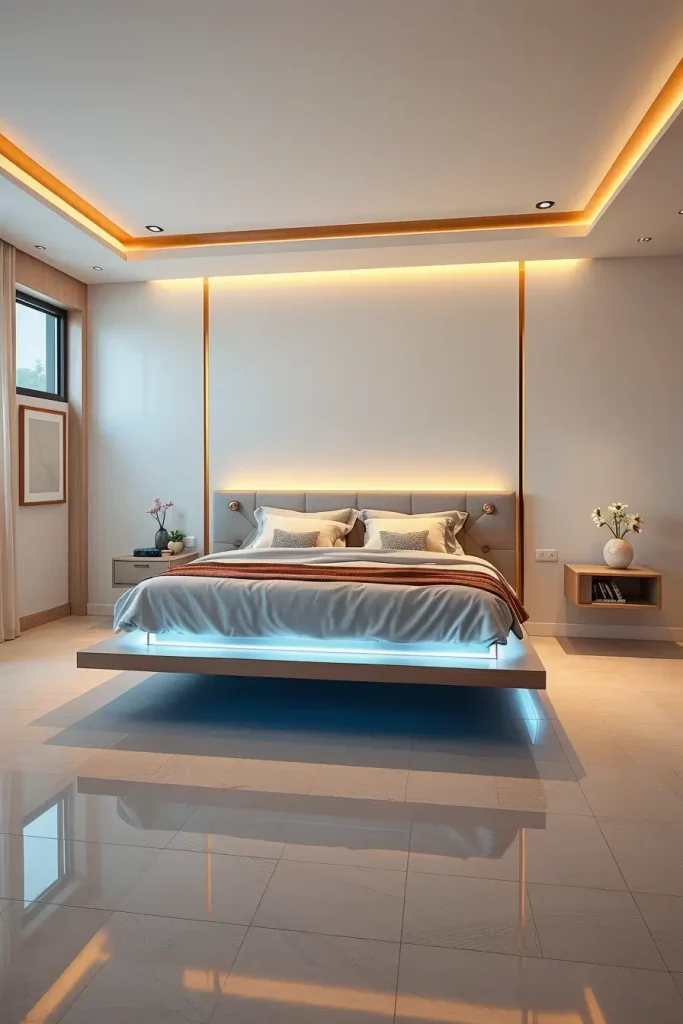 The surrounding interiors of floating beds are usually fitted with LED underlights, sleek nightstands which seem to be floating and smooth floors to augment floating effect. I like minimalistic decoration, neutral palettes, and big sizable tiles or hardwood flooring to ensure a continuous appearance. These beds are perfect to modern architecture due to the feeling of openness they have.