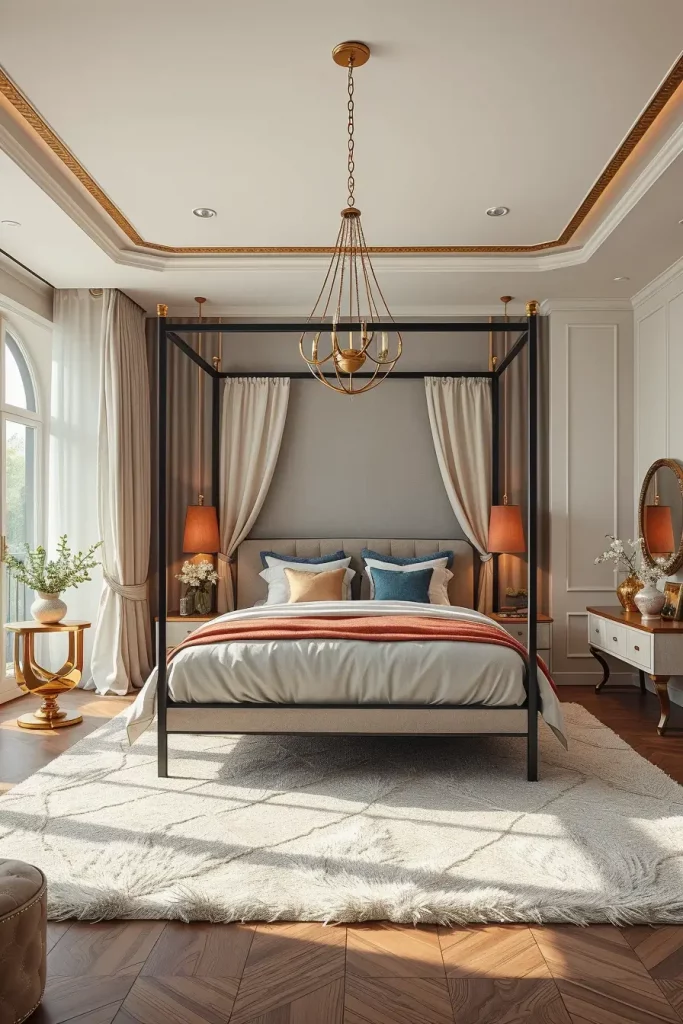 To decorate the room surrounding the canopy bed, I would use luxurious bedding, stacked window dressing, and sophisticated nightstands which make the structure sophisticated. The ornamental details like pendant lamps, plush carpets, and metals are used to enhance the general design. The canopy immediately turns out to be the highlight of the room and therefore the other furniture used should be able to complement it without competing with it.