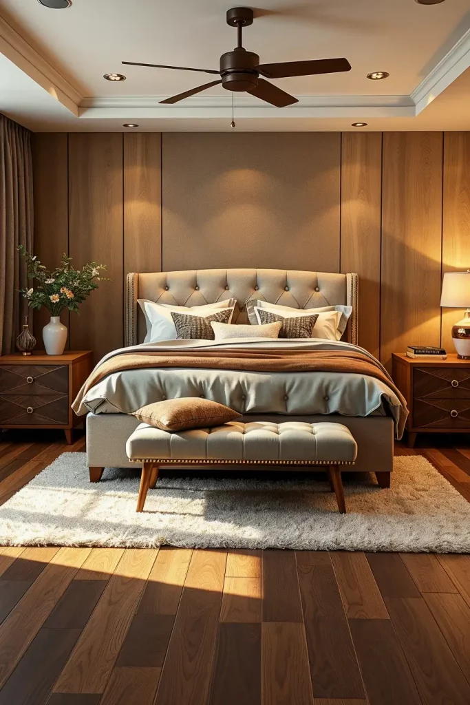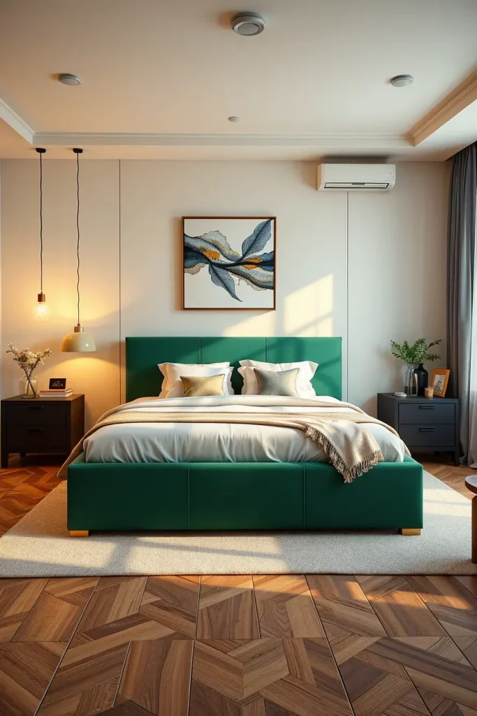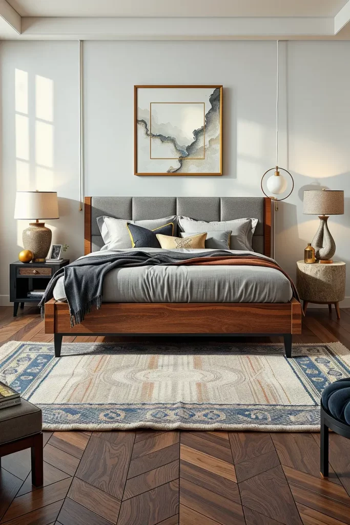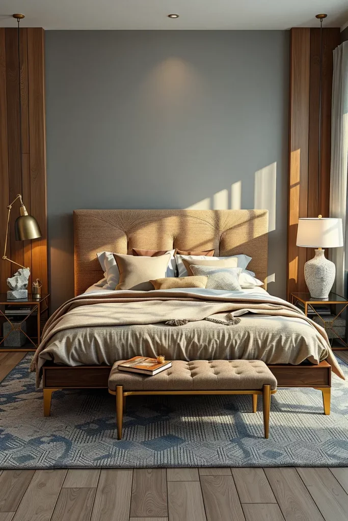 I use metal-framed beds with wooden decorations, fabric headboards with brasses, or stone-covered nightstands as well as soft fabrics in such rooms. Such combinations provide a sense of depth and make the room appear more sophisticated. The comparison between the smooth and the textured surfaces contributes to the creation of the balance and the feeling of designer quality.