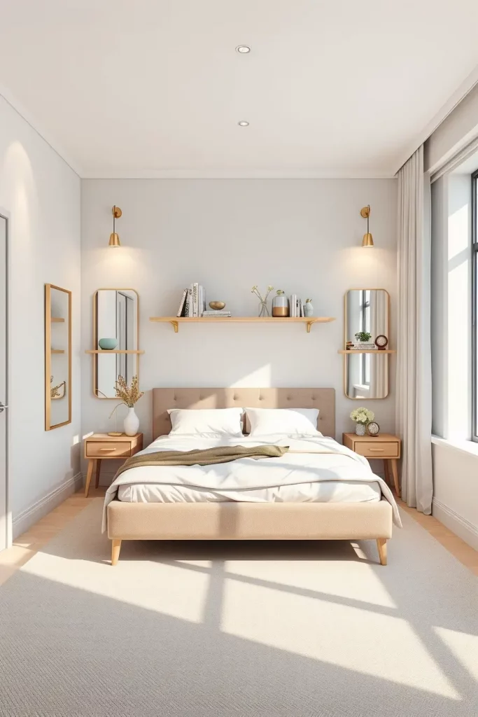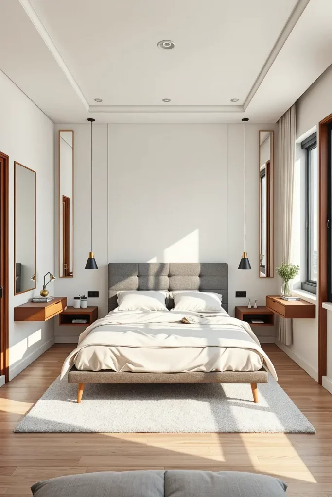 In the case of furniture, I use the skinny nightstands, floating shelves, and under-bed storage units to conserve space. Mirrors and bare decoration contribute to reflection of light throughout the room that make it look bigger. A slim frame of a bed is one of the most important decisions to make – the visual openness is maintained and the functionality is also enhanced.