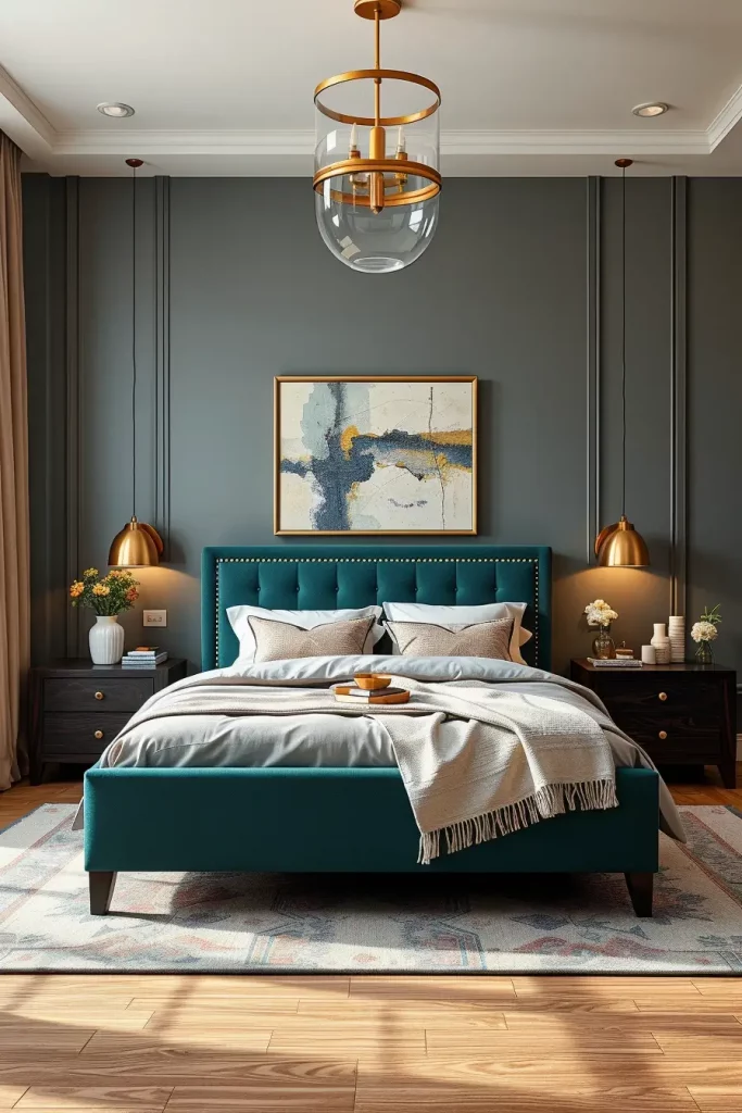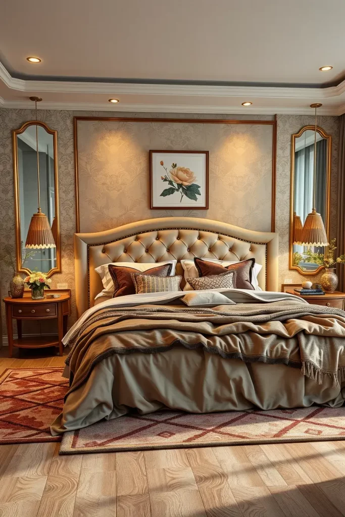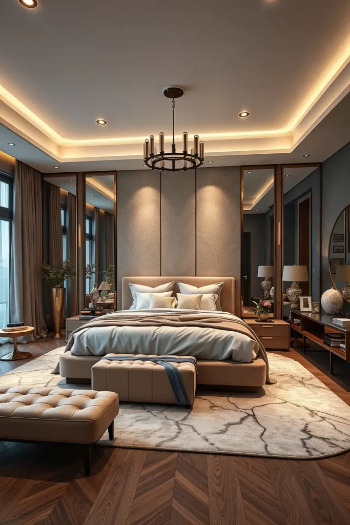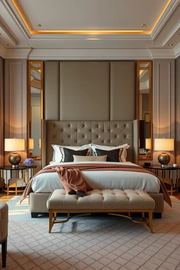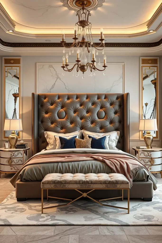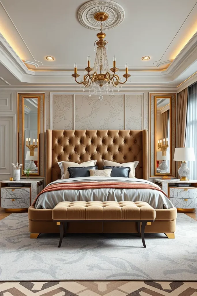 To enhance the glamour, I use marble-decorated nightstands, brass or gold lamps, and multiple bedding using fine fabrics, like Egyptian cotton or satin. There is a statement chandelier or sculptural pendant lamp light, which brings about drama, and plush throws and accent cushions finish off the luxurious appearance. These are details that make the room to look luxurious.
