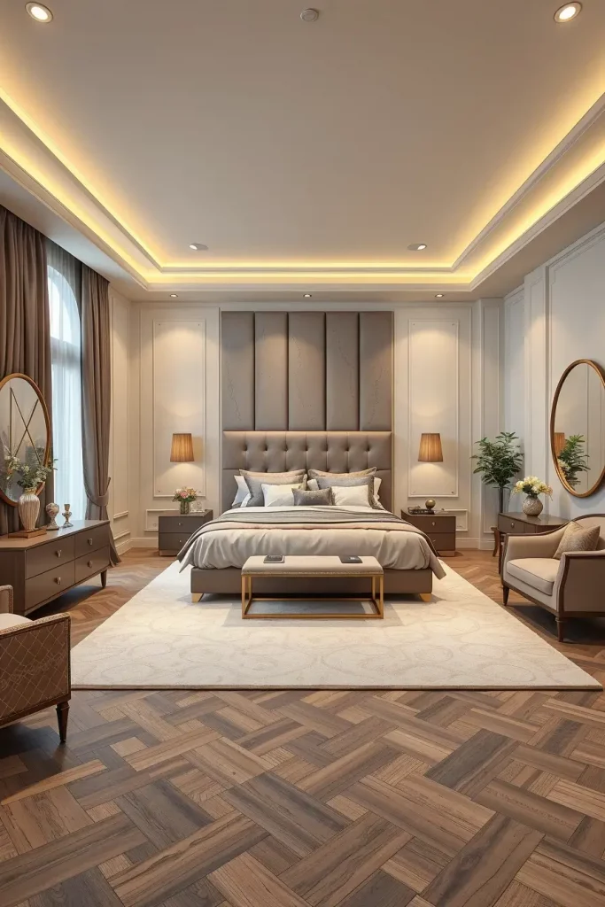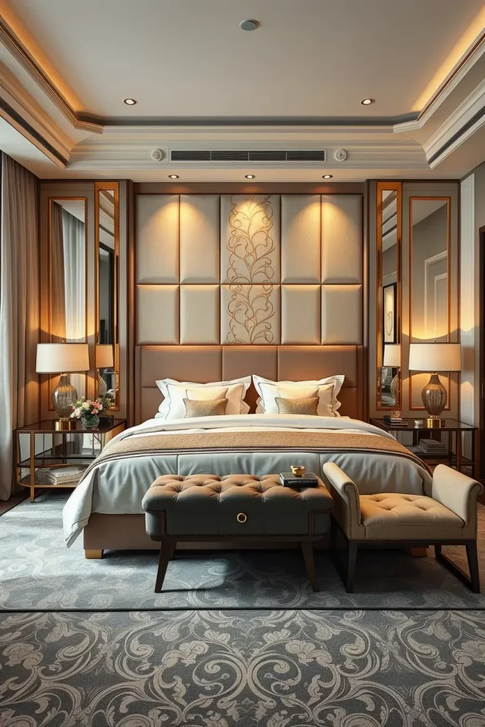 Furniture in this design comprises of polished nightstands, velvet bedding or high thread count and structured bench at the foot of the bed. The additional lighting I provide is layered lights like bedside sconces and in-ceiling lights since they provide a similar feeling of high-end hotel suites. Spareseness of decor, impersonal coloring, and tailored material enhance the general luxurious impression.