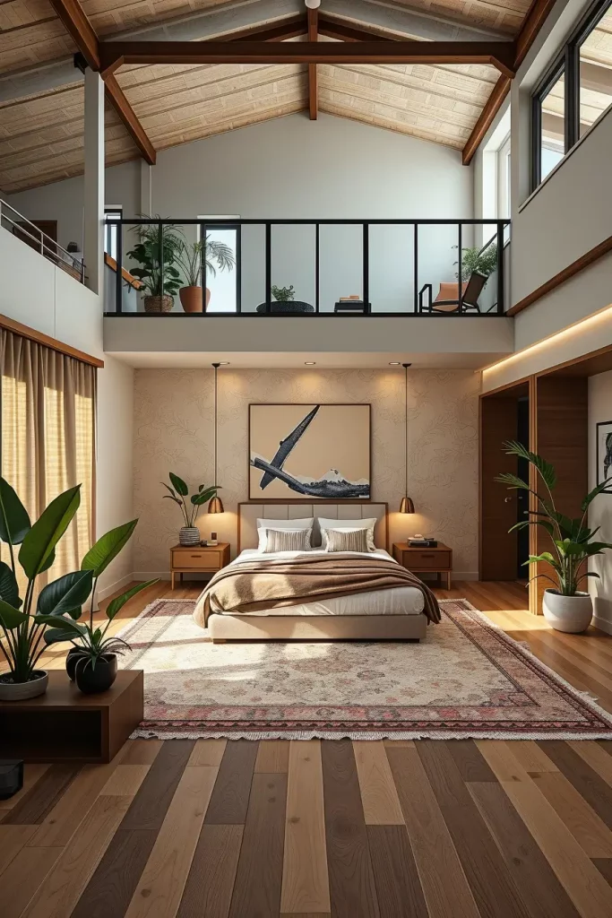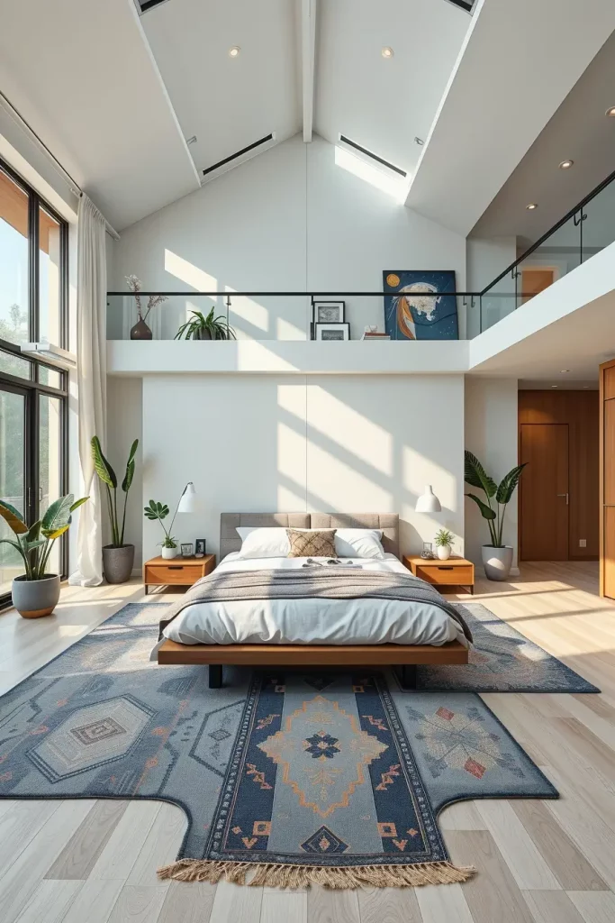 Low-profile platform beds, modular partitions and area rugs are some of the preferred ways of structuring the layout in these spaces. The open framed nightstands, tall plants or free standing screens make the room airy and sense of division is created. Soft indirect lighting serves also in directing the eye and keeping the fluidity which is needed in open-concept rooms.