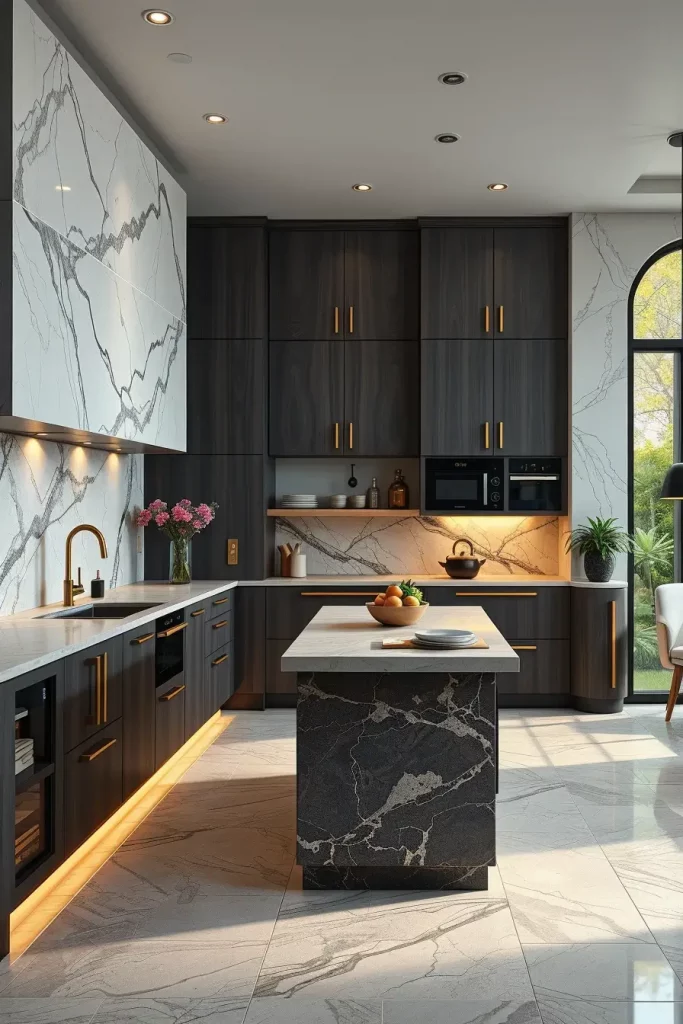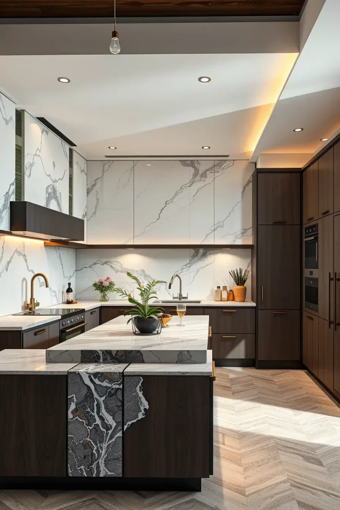 My customary features are full-height stone backsplash, waterfall edges of the islands, smoked wood cabinets, and fine quality metal trims. These details bring about a sculptural, stratified texture that raises the kitchen immediately. Their imagery richness and natural anomalies brings in a notion of luxury that is human and normal instead of cold and unnatural.