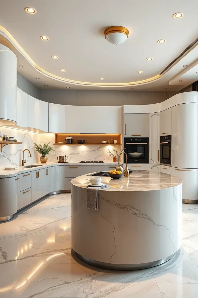 On the professional level, I have realized that curved features make the kitchen a more comfortable place to be. According to interior design magazines such as the House Beautiful, curved forms encourage the feeling of comfort and indulgence. I have encountered it personally, and particularly in the family-related houses, where gentle edges make the place safer and enhance circulation. The organic beauty is also improved with the use of curves combined with natural materials.