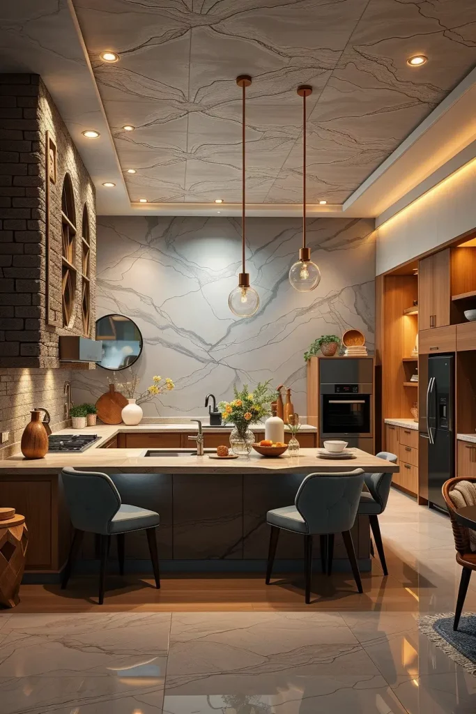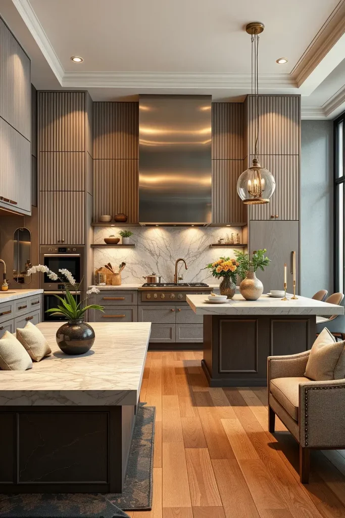 One of the most powerful luxury kitchen design attributes of 2026 will be the element of textural contrast, and I also like applying this method to add sensuality to the space. Matte and glossy, smooth and ribbed surfaces, natural and sculpted materials may be combined to make surfaces depth and intrigue. This design plan creates a sense of elegance and at the same time makes the kitchen more dynamic instead of flat or one-dimensional.