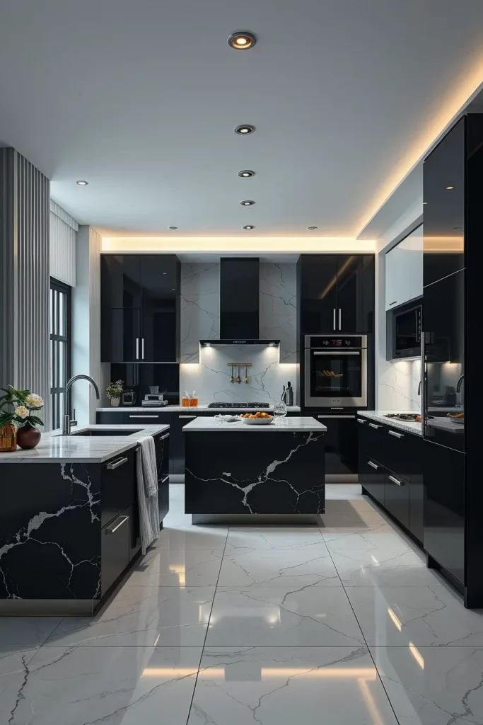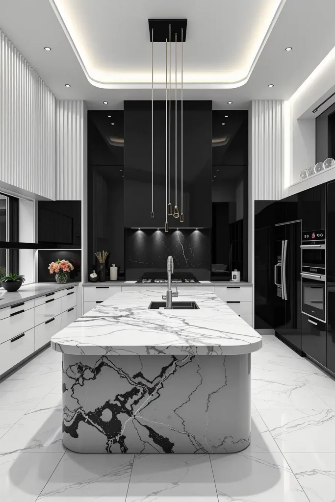 In the case of the furniture and finishes, I tend to make my decision on furniture and finishes such as handleless cabinetry and a soft-touch matte finish, waterfall stone islands either solid white or black and built-in appliances that blend in the design. The major characteristics are veined marble surfaces, texture created by ribbed or fluted panels and reflective metals such as chrome or black nickel. I also make sure to use strategic accent lighting to make edges, corners, and vertical surfaces contrast, instead of making them sharp.