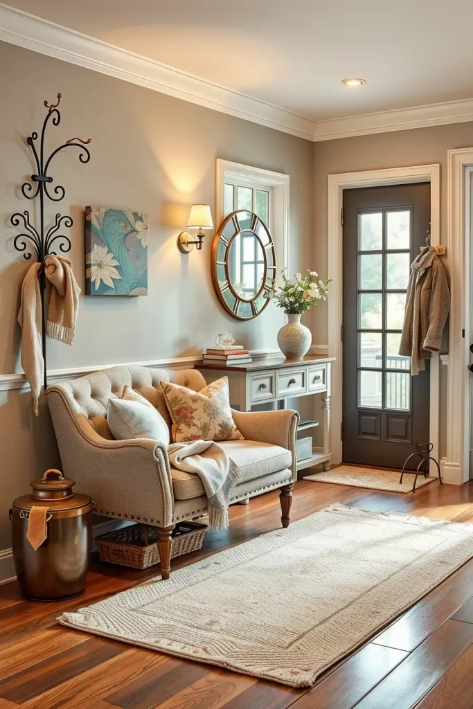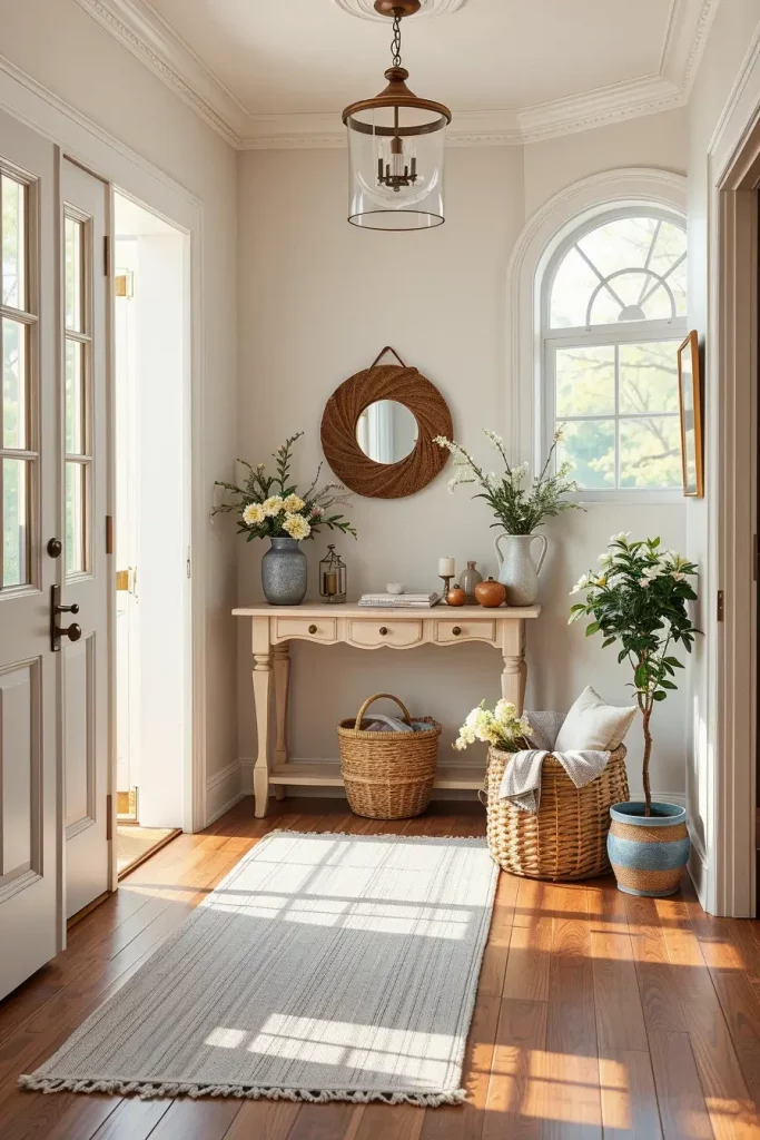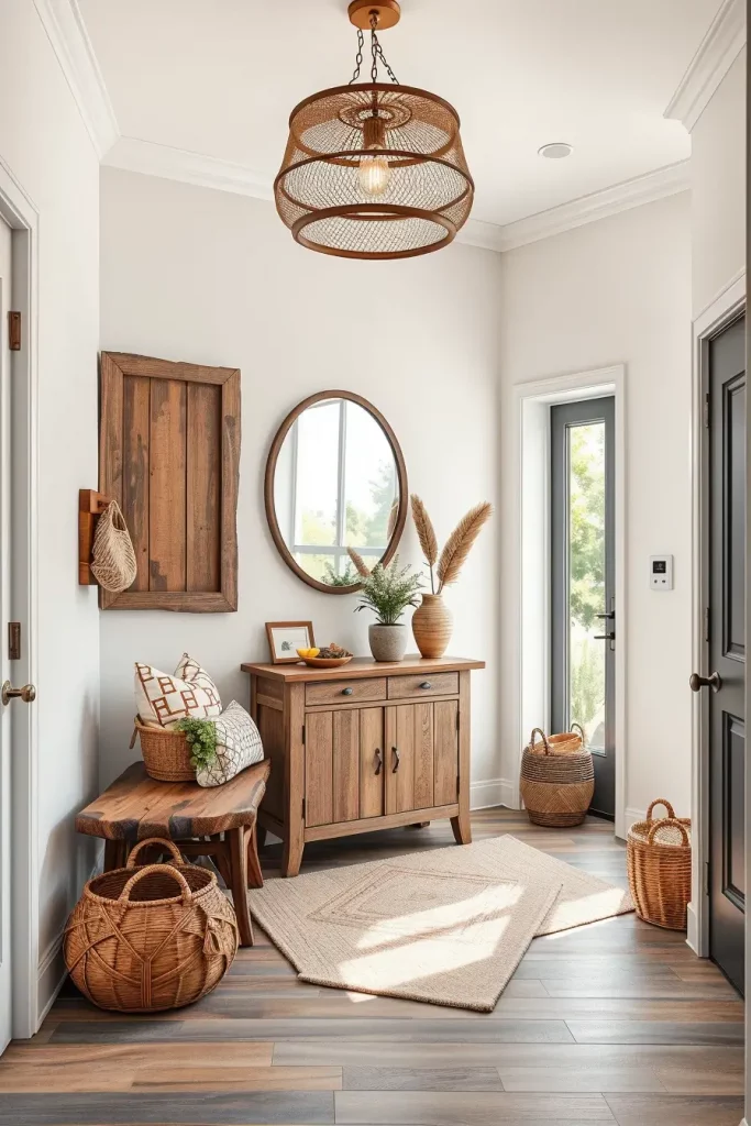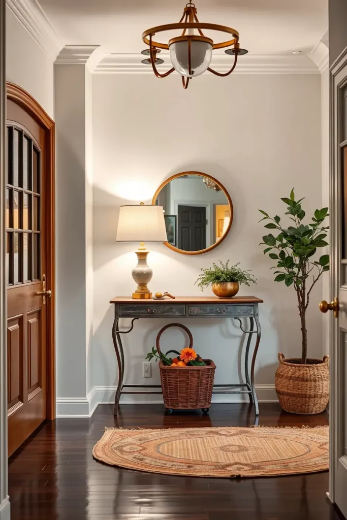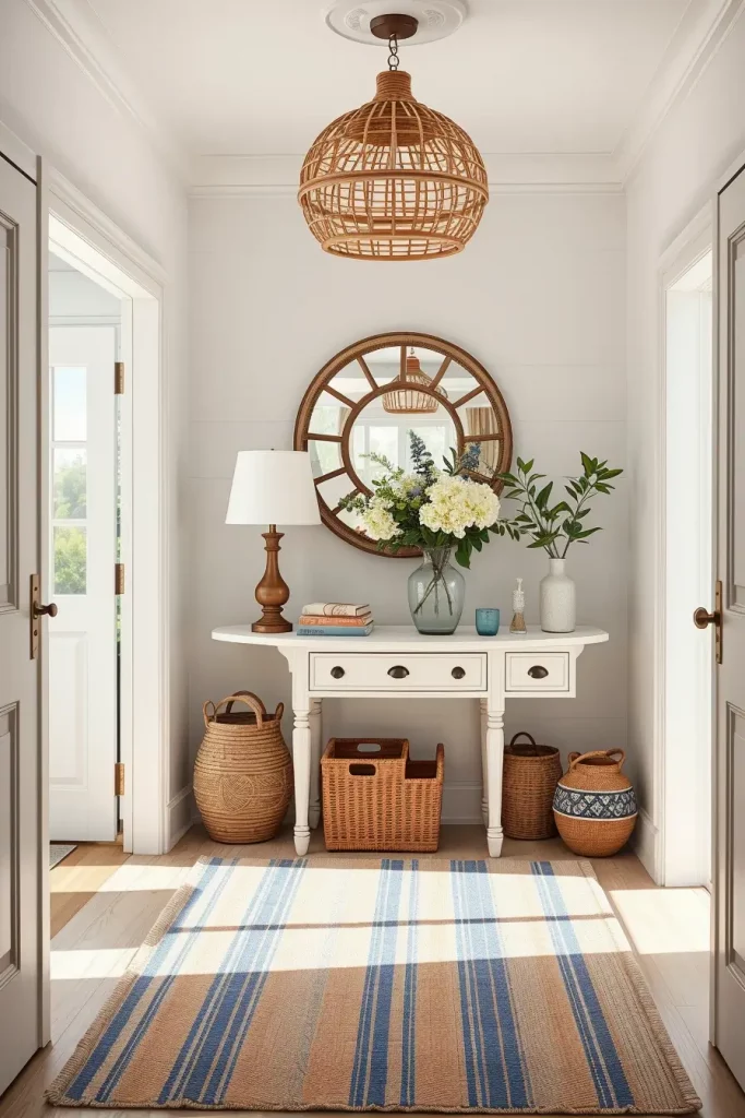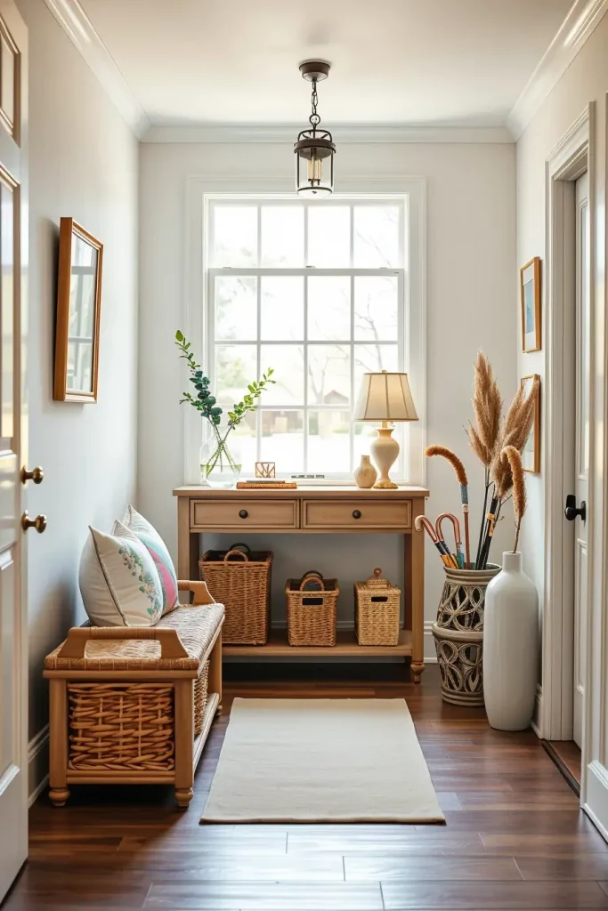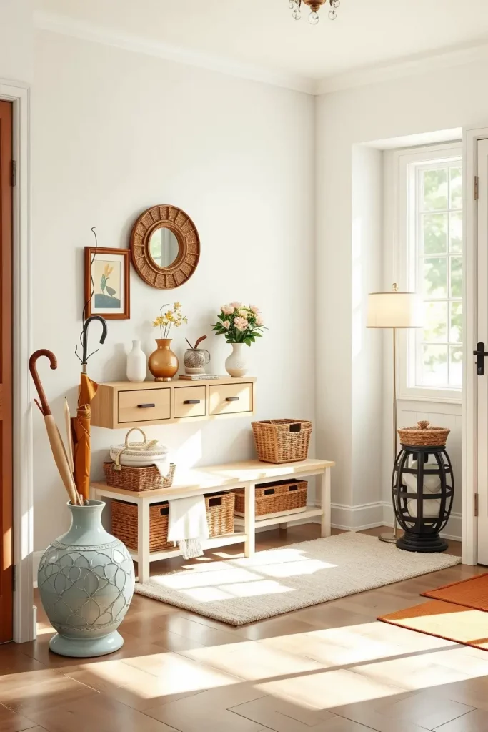 In my own design, I would include furniture such as a solid console table with drawers, a bench with storage compartments and nice baskets to keep shoes or accessories. These works are not only functional to an organization, but they also provide texture and personality. A woven basket or a ceramic umbrella stand is an example of this, and it will not feel like it is being forced to fit in with the rest of the style. Lighting is also of paramount importance a small lamp or a pendant hanging over the space will make the area look bright and inviting at any hour of the day.