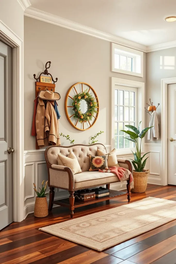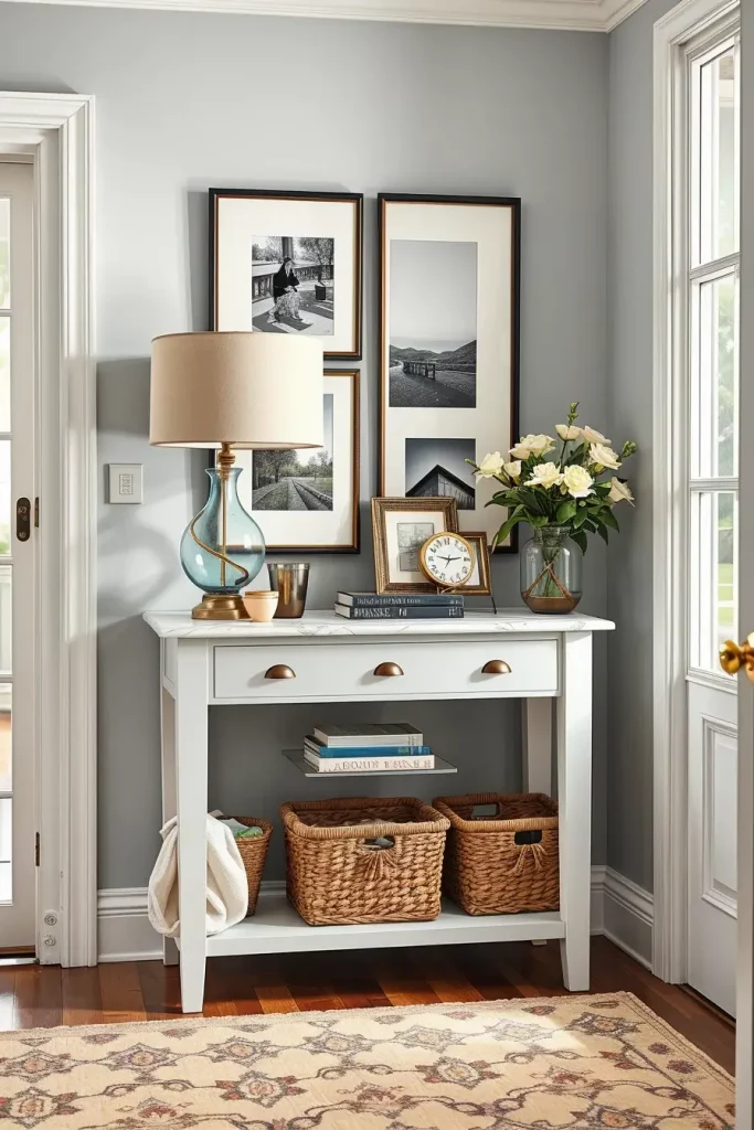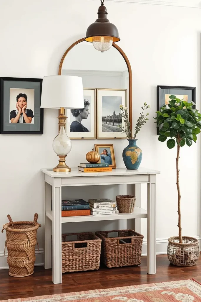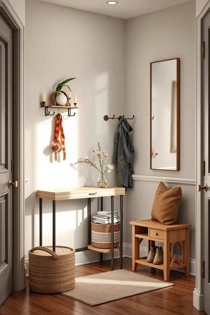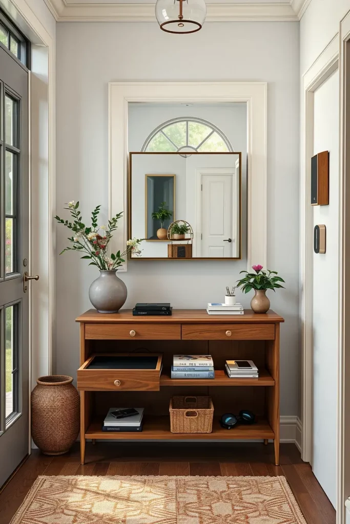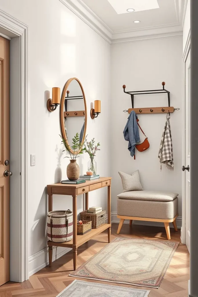 In my own design, I would include furniture such as a solid console table with drawers, a bench with storage compartments and nice baskets to keep shoes or accessories. These works are not only functional to an organization, but they also provide texture and personality. A woven basket or a ceramic umbrella stand is an example of this, and it will not feel like it is being forced to fit in with the rest of the style. Lighting is also of paramount importance a small lamp or a pendant hanging over the space will make the area look bright and inviting at any hour of the day.