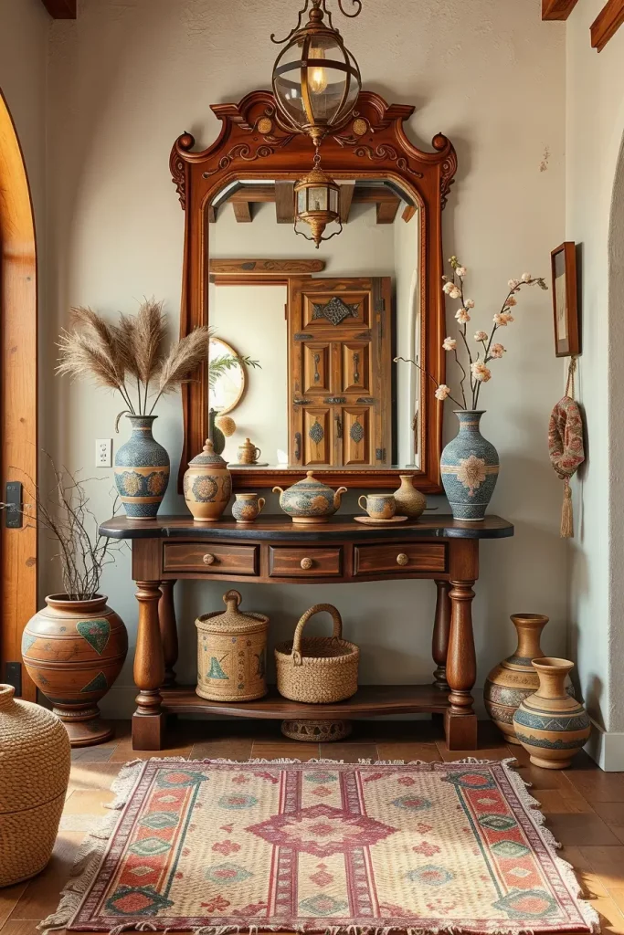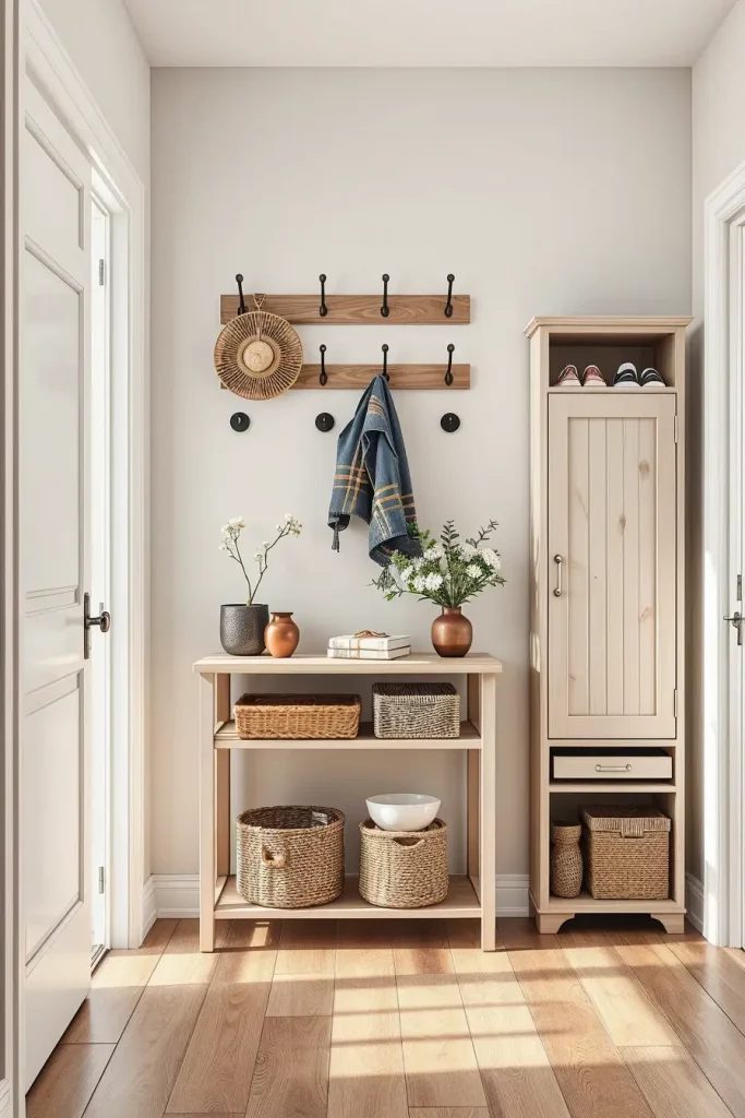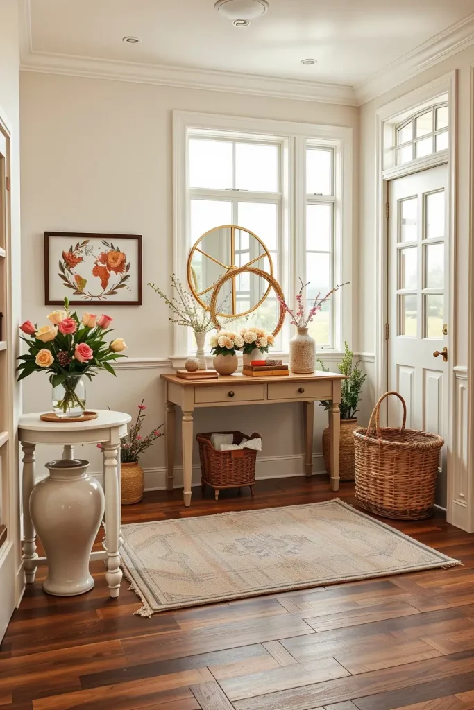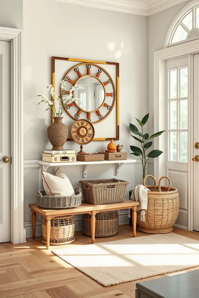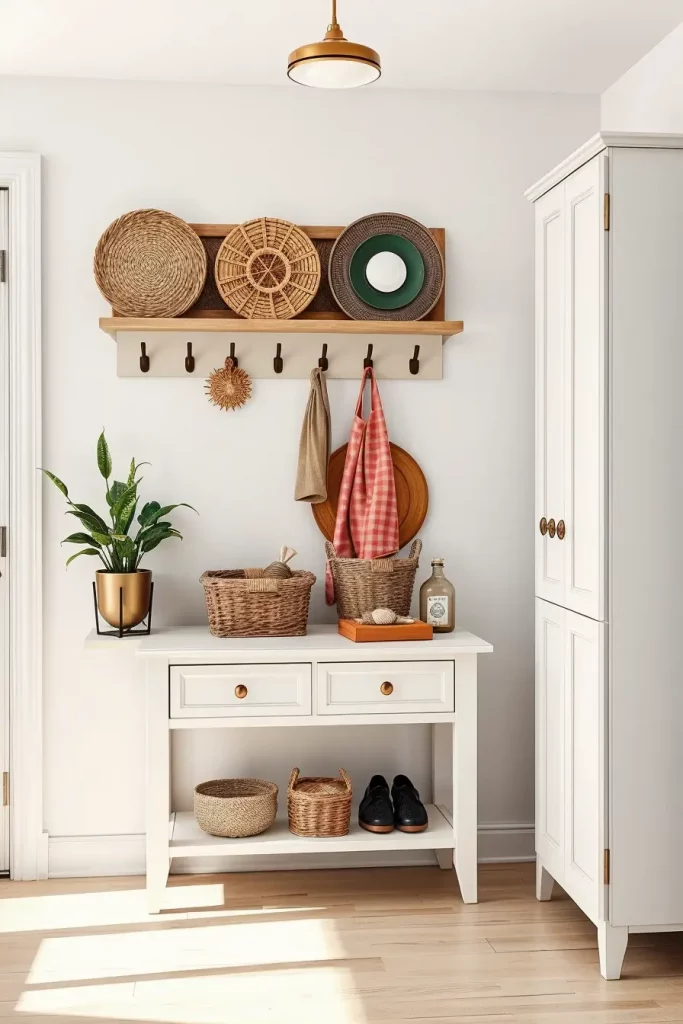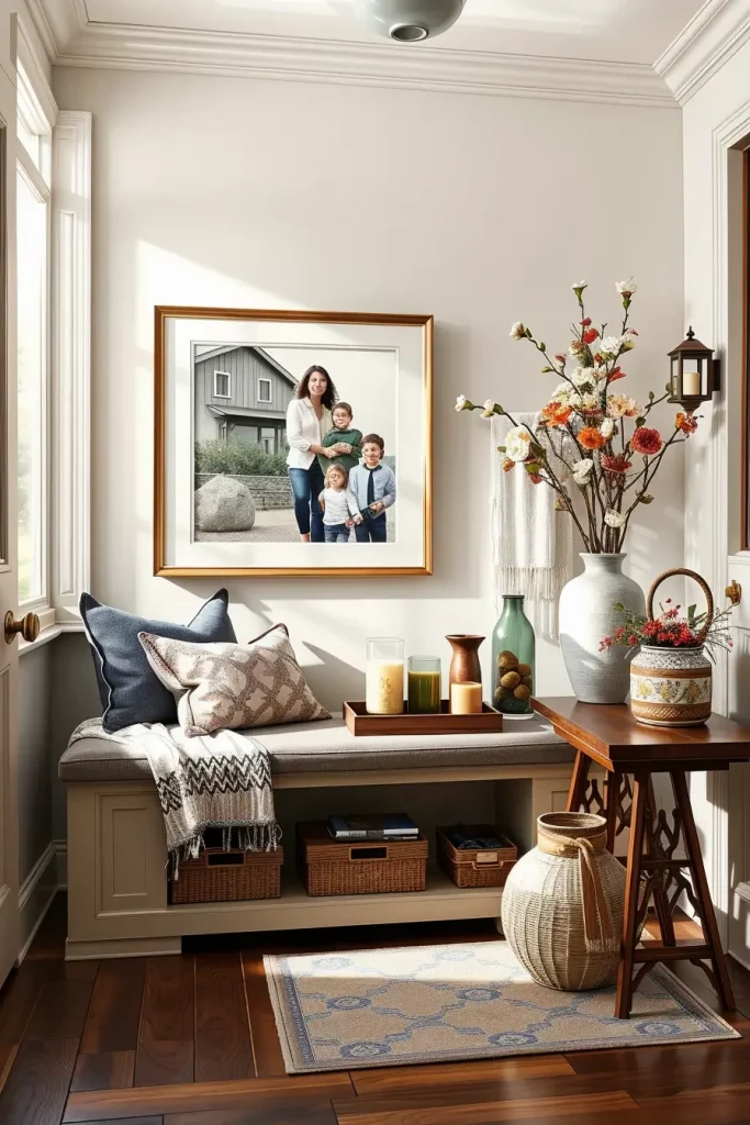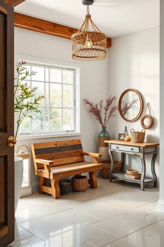 In my own design, I would include furniture such as a solid console table with drawers, a bench with storage compartments and nice baskets to keep shoes or accessories. These works are not only functional to an organization, but they also provide texture and personality. A woven basket or a ceramic umbrella stand is an example of this, and it will not feel like it is being forced to fit in with the rest of the style. Lighting is also of paramount importance a small lamp or a pendant hanging over the space will make the area look bright and inviting at any hour of the day.