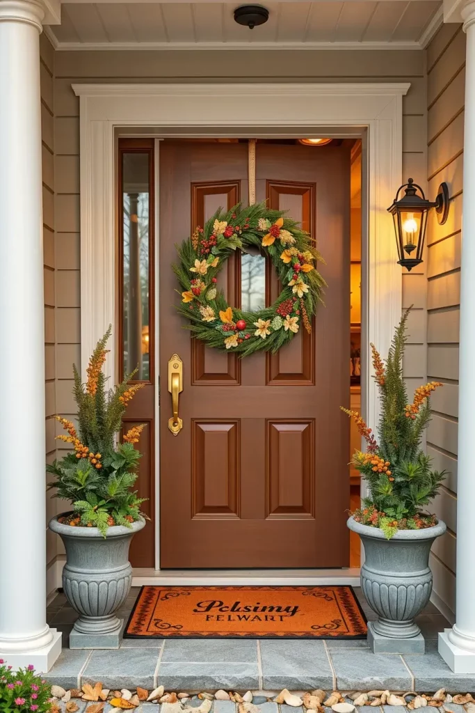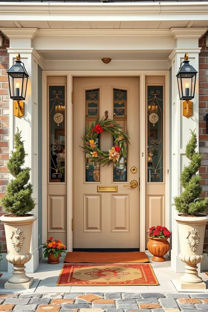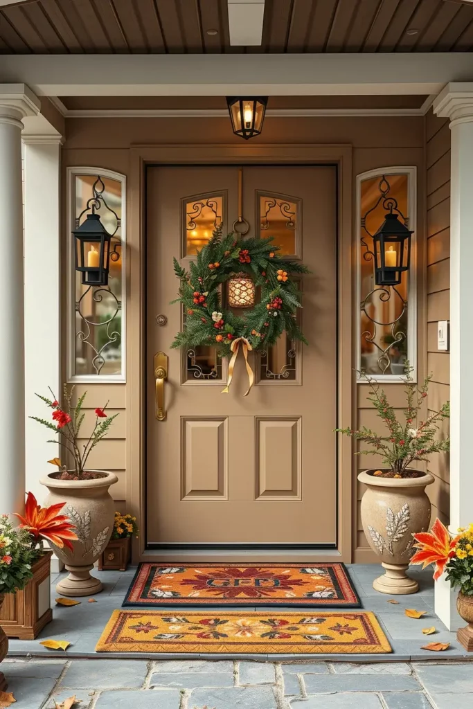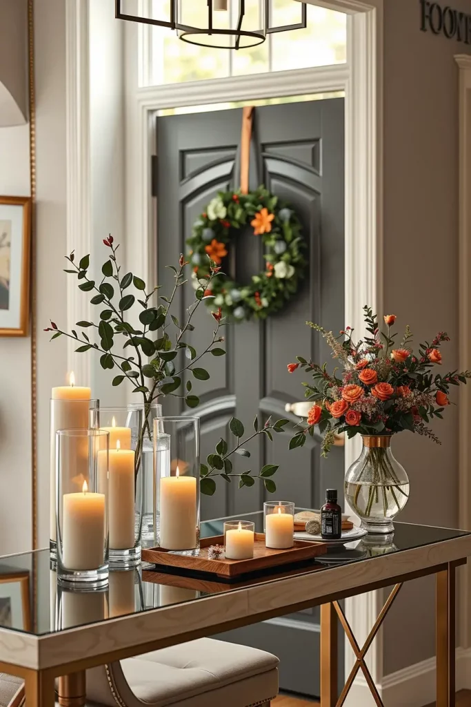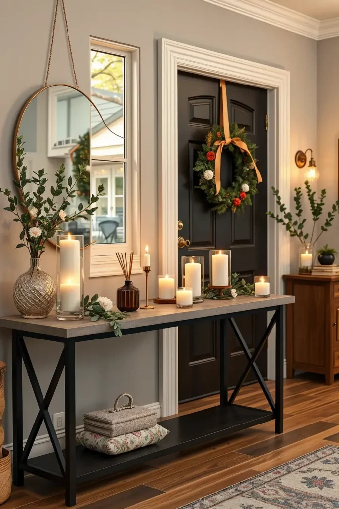 The main decorative objects are often the focus of the holiday doorways. I prefer evergreen wreaths, string lights, and metallic ornaments on a console to use during Christmas. In fall, I add pumpkins, autumn leaves and rustic lanterns. Pastel flowers or Easter decorations are cheerful during spring holidays.