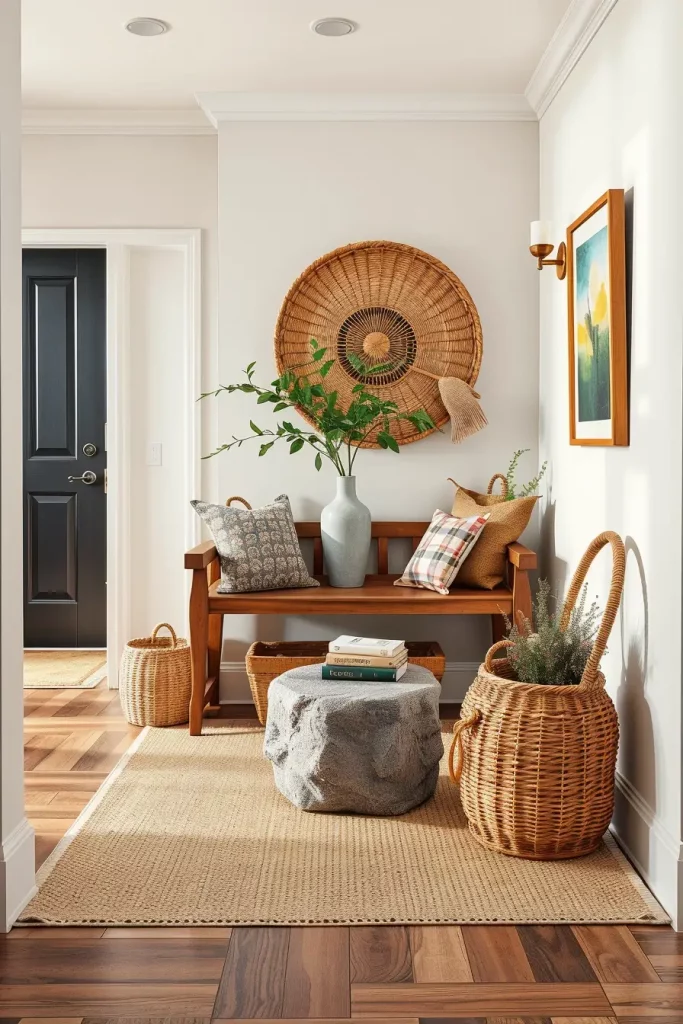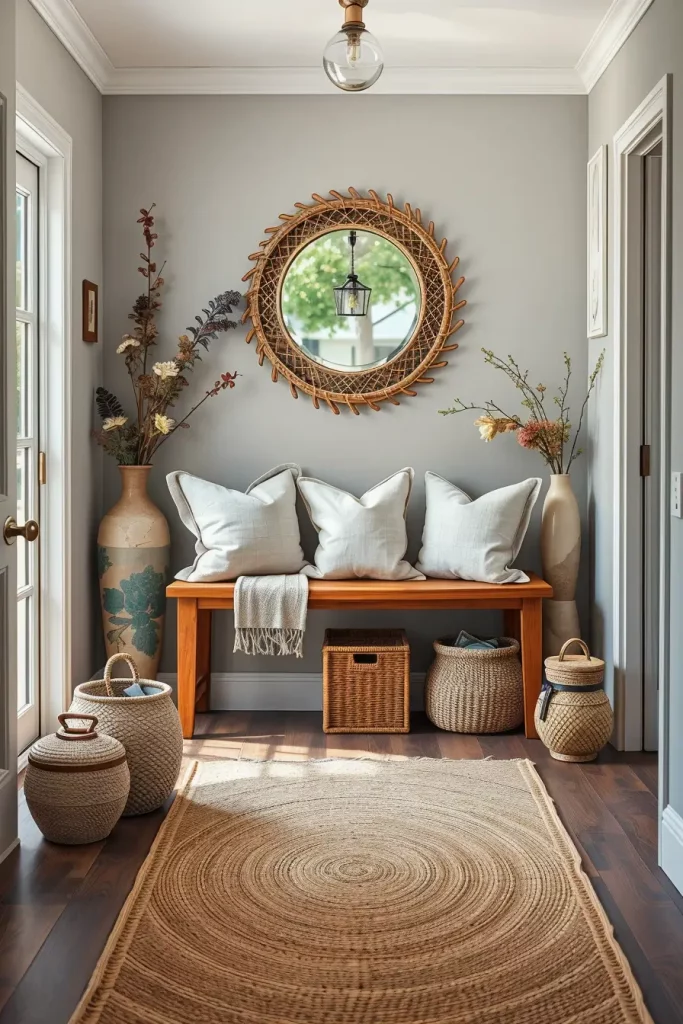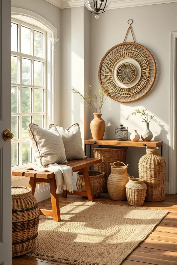 Each texture has a purpose. A jute rug is able to withstand heavy foot traffic and also provide an organic touch. Pillows made of linen or velvet on a seating bench add a sense of comfort and a wooden console table with a smooth polished surface provides balance. The space is cozy but elegant even with such minor details as ceramic vases, woven baskets or a rattan mirror frame.