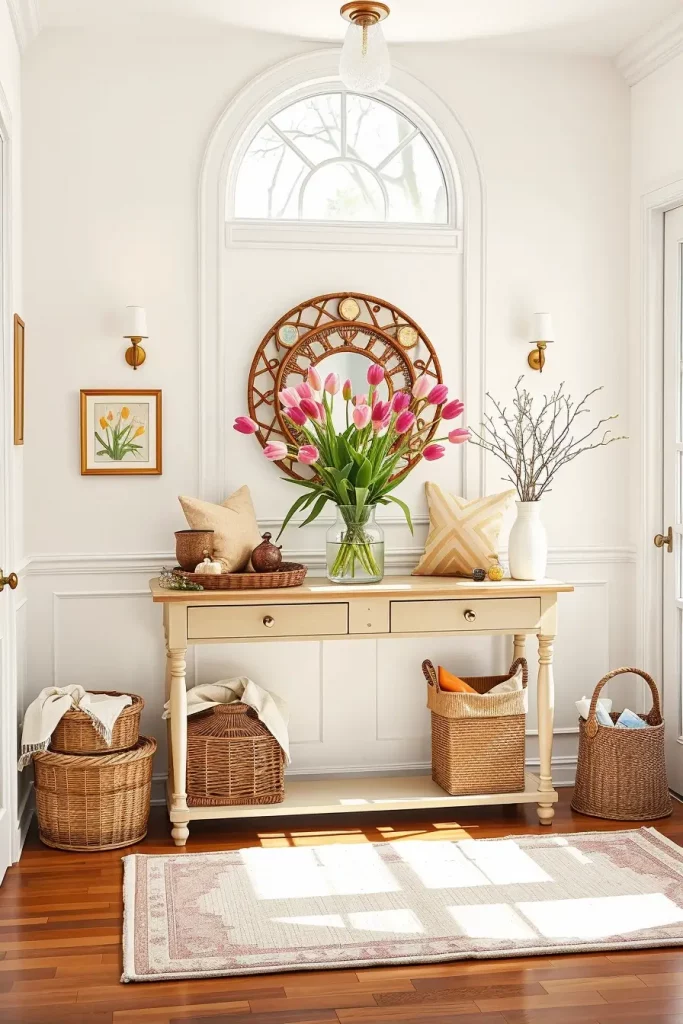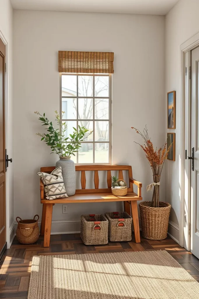 I have always found that it is a strong design decision to layer textures in the entryway. A plain bench is made warmer by a woven throw, a patterned rug brings the space to the ground, and wicker baskets make the hard lines softer. Not only does this technique add depth to the visuals, but it also produces a warm effect that is immediately inviting. I use these little layers when creating entryways because I do not want to overload the room with sophistication.