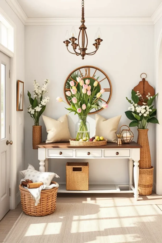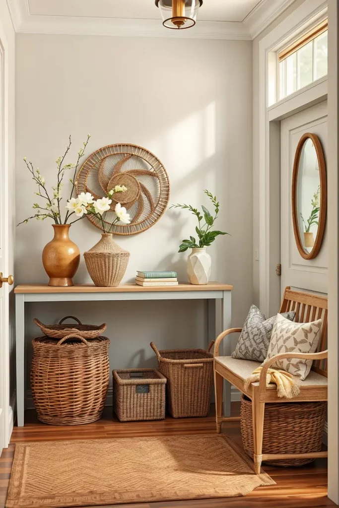 I would prefer wooden bench, woven basket and possibly stone vase or ceramic planter in my entry way decorations. At the same time, these materials are durable, versatile and can be used with seasonal accents.